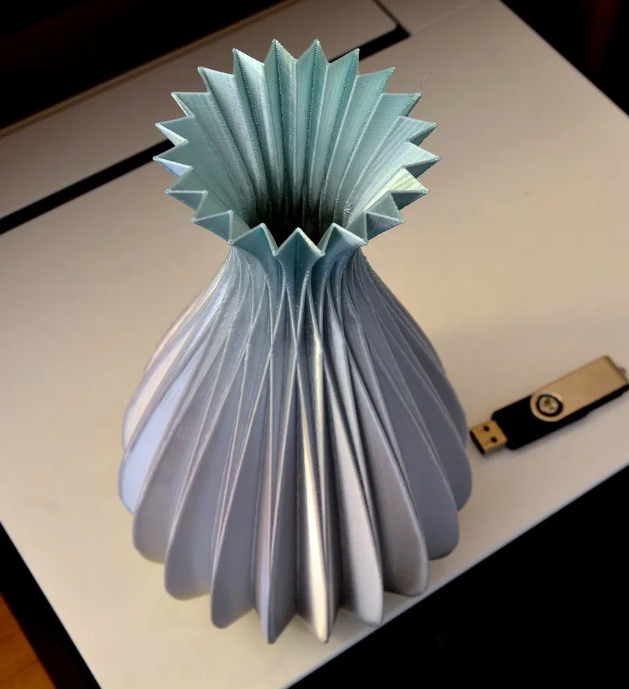 Ảnh chụp cho thấy bình được in ở chế độ "vase mode". Bạn có thể in ở chế độ "vase mode" hoặc "normal mode" với 0 lớp trên, 0% infill, 1 hoặc nhiều lớp tường và 3 hoặc nhiều lớp đáy. File STL là dạng khối đặc. In đẹp ở cả hai chế độ.
