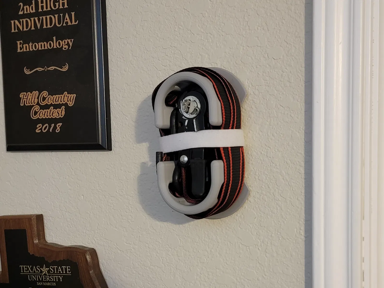 Chán ngán với mớ dây ràng và móc câu lộn xộn hả? Vậy thì đừng tìm đâu xa nữa. Cái "giá đỡ dây ràng" tiện lợi này sẽ biến mớ dây mì spaghetti của bạn thành những bộ đồ dùng gọn gàng. Mỗi giá đỡ được thiết kế để sử dụng bốn cục nam châm 10 x 3 mm và một sợi dây Velcro dài 16 inch, rộng ¾ inch. Nam châm giữ phần móc của dây ràng vào thân giá đỡ khi bạn quấn, còn dây Velcro thì giữ cả dây và bộ phận tăng đơ vào đúng vị trí. Tuy nhiên, bạn không nhất thiết phải dùng cả hai thứ này. Một sợi dây thun bình thường là đủ để giữ mọi thứ ổn thỏa, hoặc bạn có thể tự nghĩ ra giải pháp riêng với các lỗ được cung cấp sẵn. Hãy quẳng những giá đỡ này vào hộp đồ nghề của bạn, để trong xe tải, hoặc thậm chí treo chúng cạnh những giải thưởng cuộc thi côn trùng học của bạn nhờ cái móc treo tích hợp. Rồi khi sẵn sàng, bạn có thể dễ dàng lấy dây ra mà không bị rối.