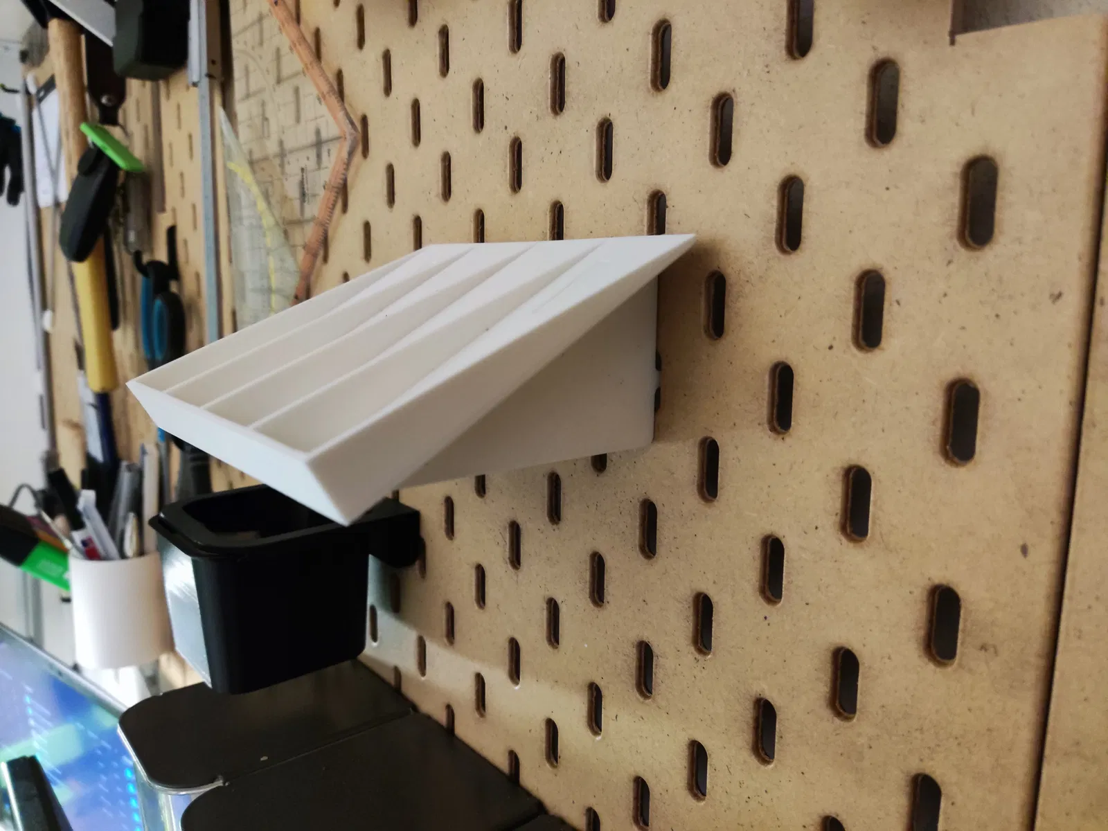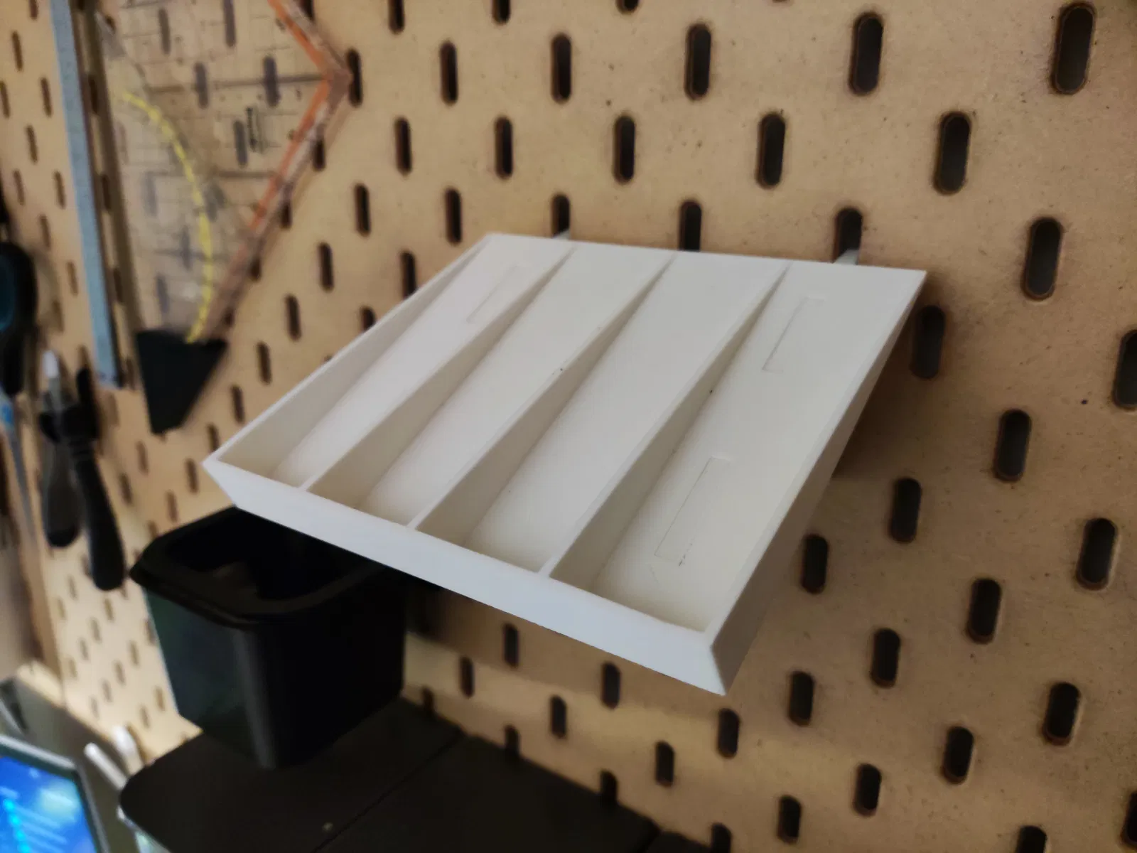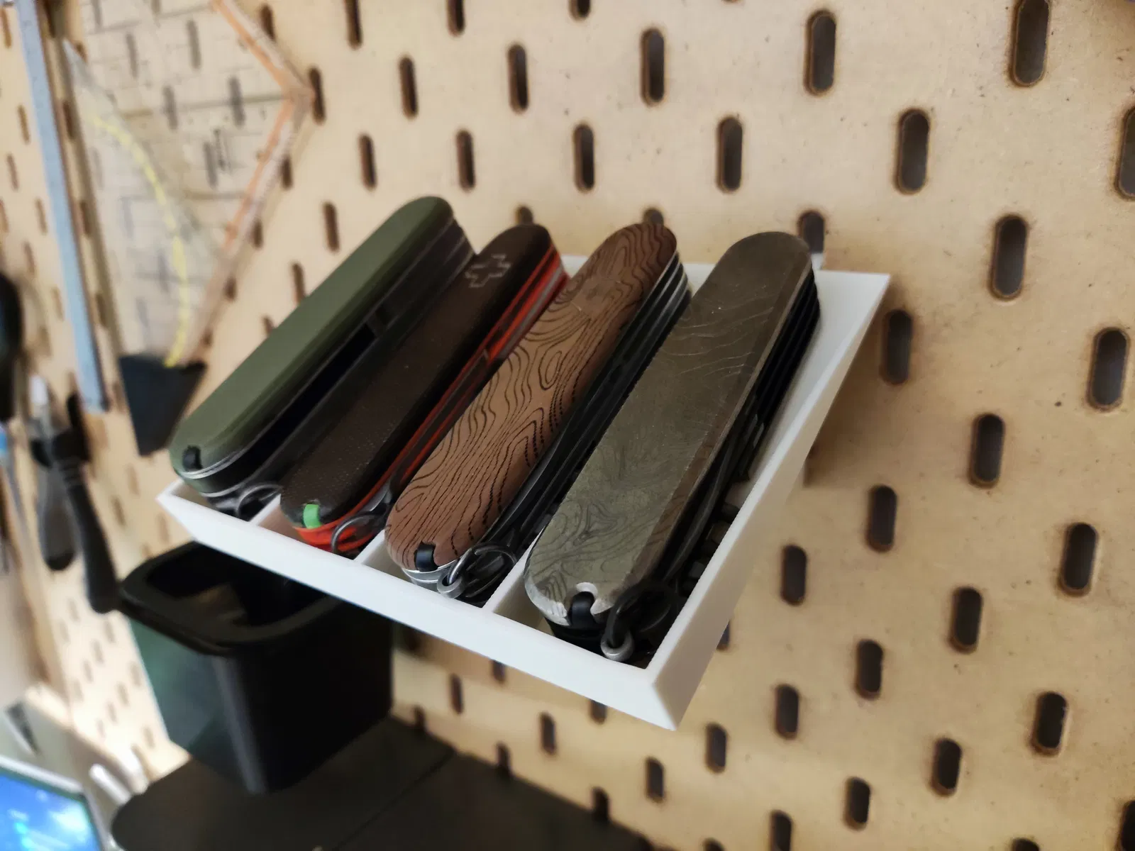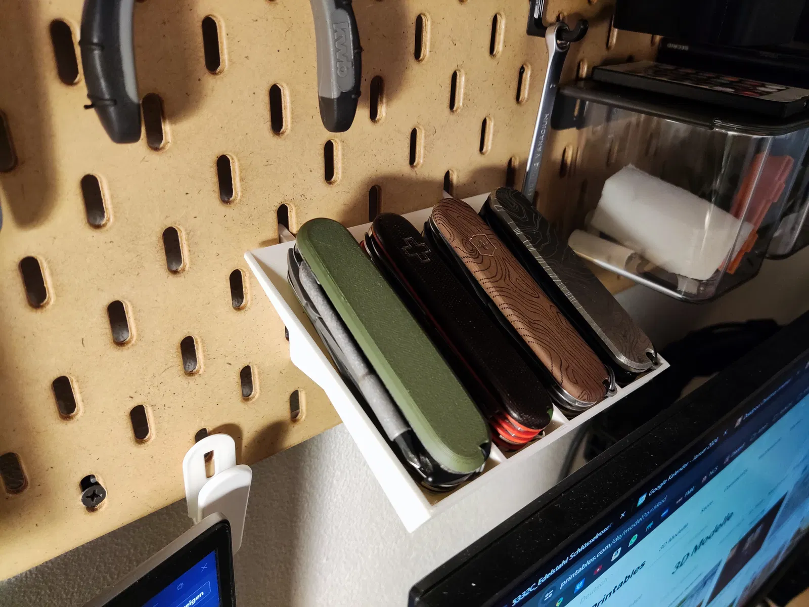 Một cái kệ cho bảng Skadis. Trong đó bạn có thể cất giữ 4 con dao Victorinox 91 mm hoặc các mẫu nhỏ hơn.