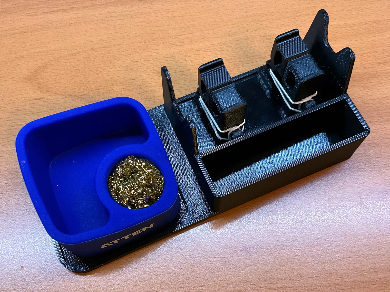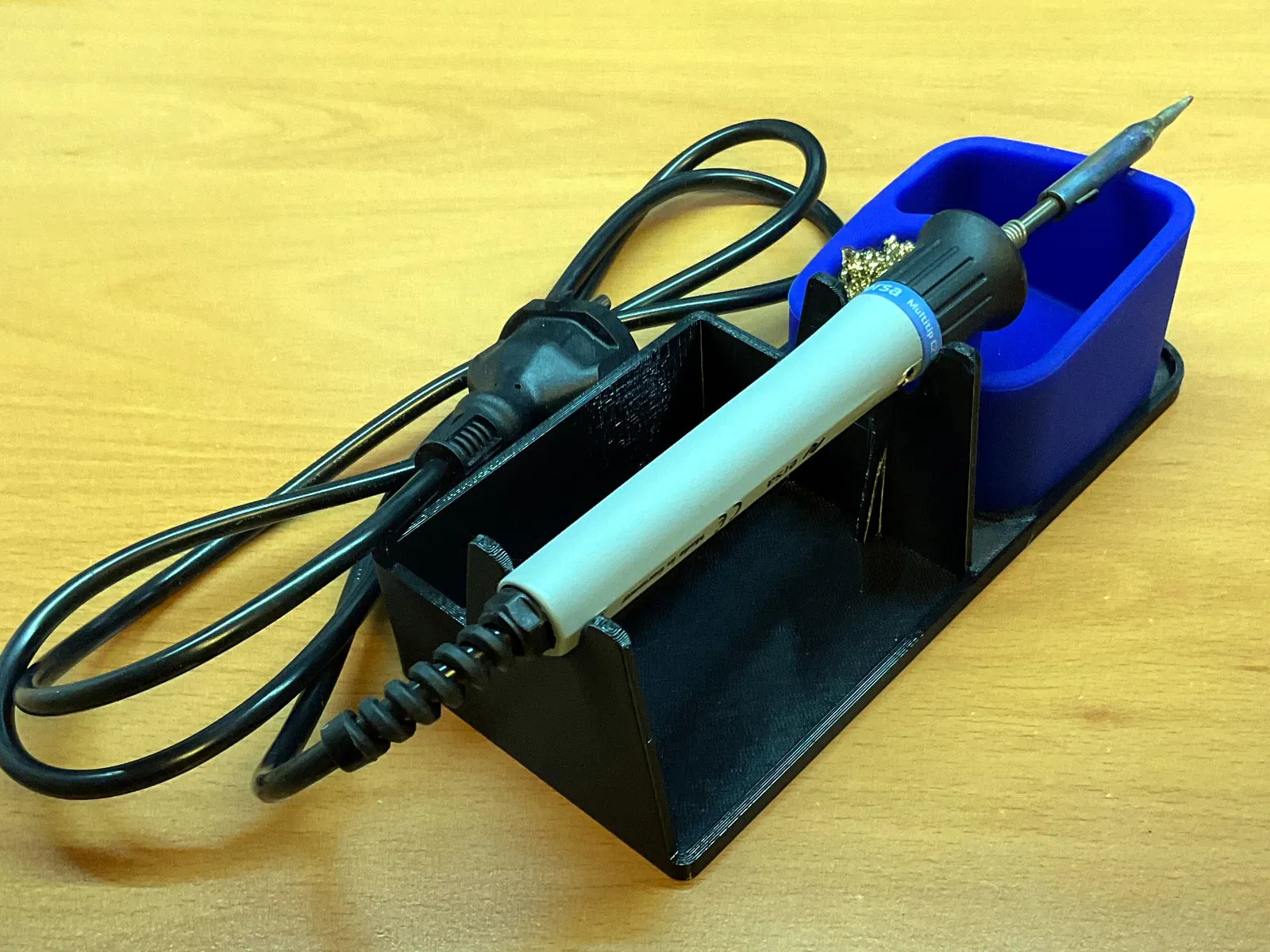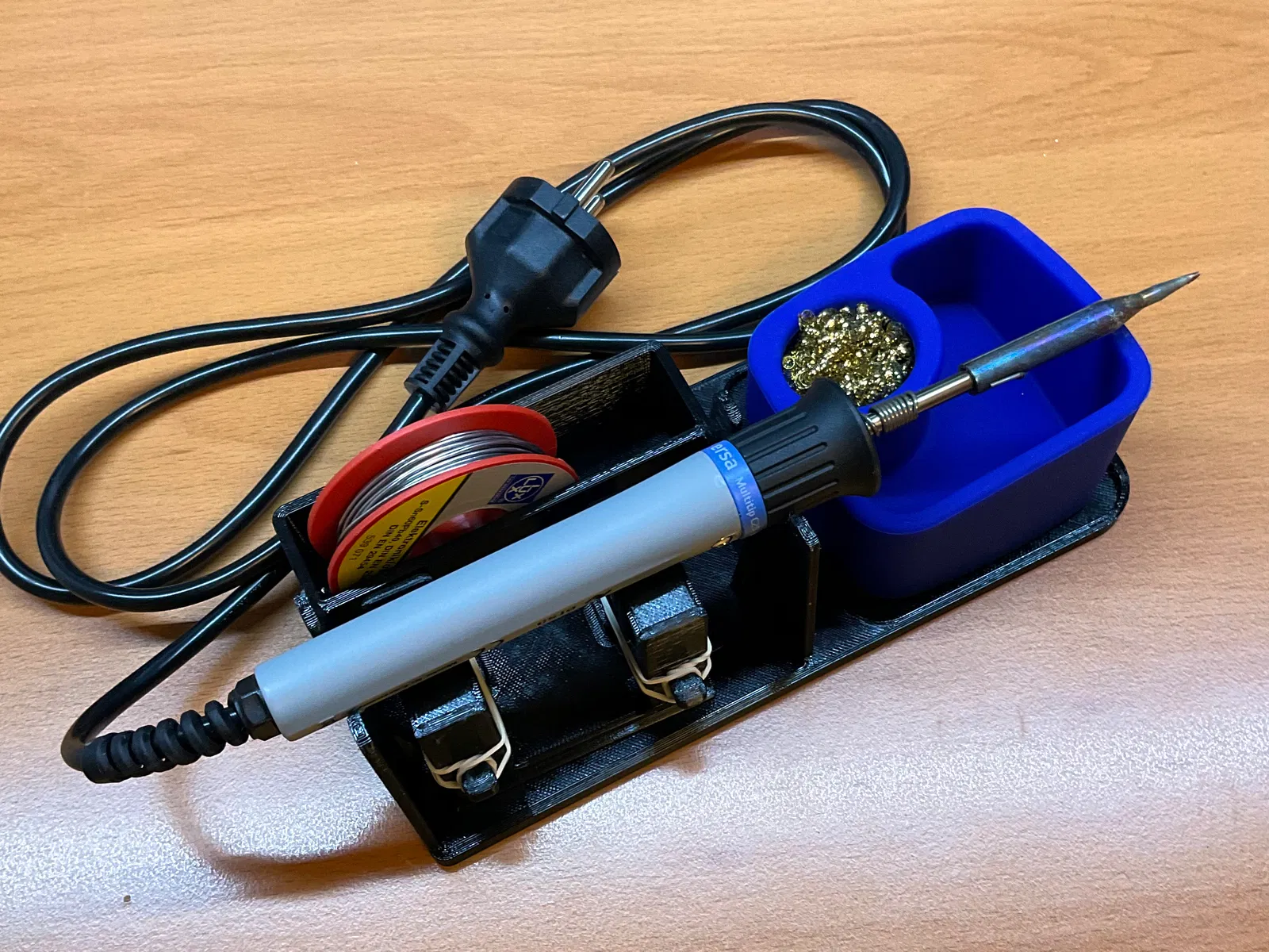 Giá đỡ mỏ hàn đơn giản, có chỗ đựng phụ kiện và khay chứa bọt biển đồng vệ sinh đầu mỏ hàn. Thích hợp cho mỏ hàn Ersa Multitip hoặc các loại tương tự. In đơn giản, tùy chỉnh cài đặt theo ý thích. Chất liệu PETG, in với 3 lớp biên và 15% ruột đặc cho độ cứng cáp cao.