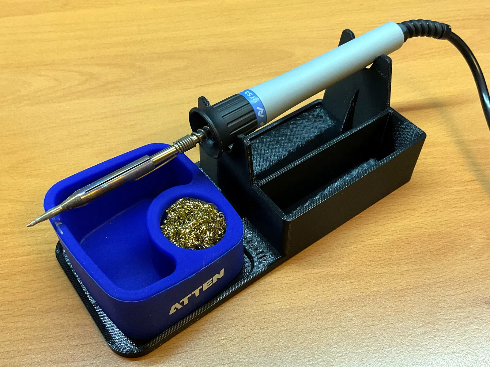 Giá đỡ mỏ hàn đơn giản, có chỗ để phụ kiện hàn và chỗ cho hộp đựng bọt biển đồng để vệ sinh đầu mỏ hàn. Cái này làm cho mỏ hàn Ersa Multitip, nhưng loại tương tự thì cứ gắn vô tư nha. In đơn giản thôi. Cài đặt in thì tùy chỉnh theo ý mình ha. Tui in với 3 lớp biên và 15% ruột đặc - cái giá đỡ cứng cáp lắm.