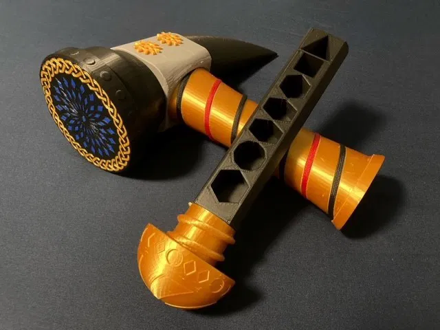 Mặt trước của búa được thiết kế cho mục đích đa vật liệu. Phần thân chính của mặt búa có hai họa tiết, một họa tiết bện xung quanh và họa tiết hình kim cương ở trung tâm. Để in được các họa tiết này, bạn cần tách tệp STL thành các phần trong phần mềm slicer. Nếu không, bạn sẽ không thấy các bộ phận riêng biệt.