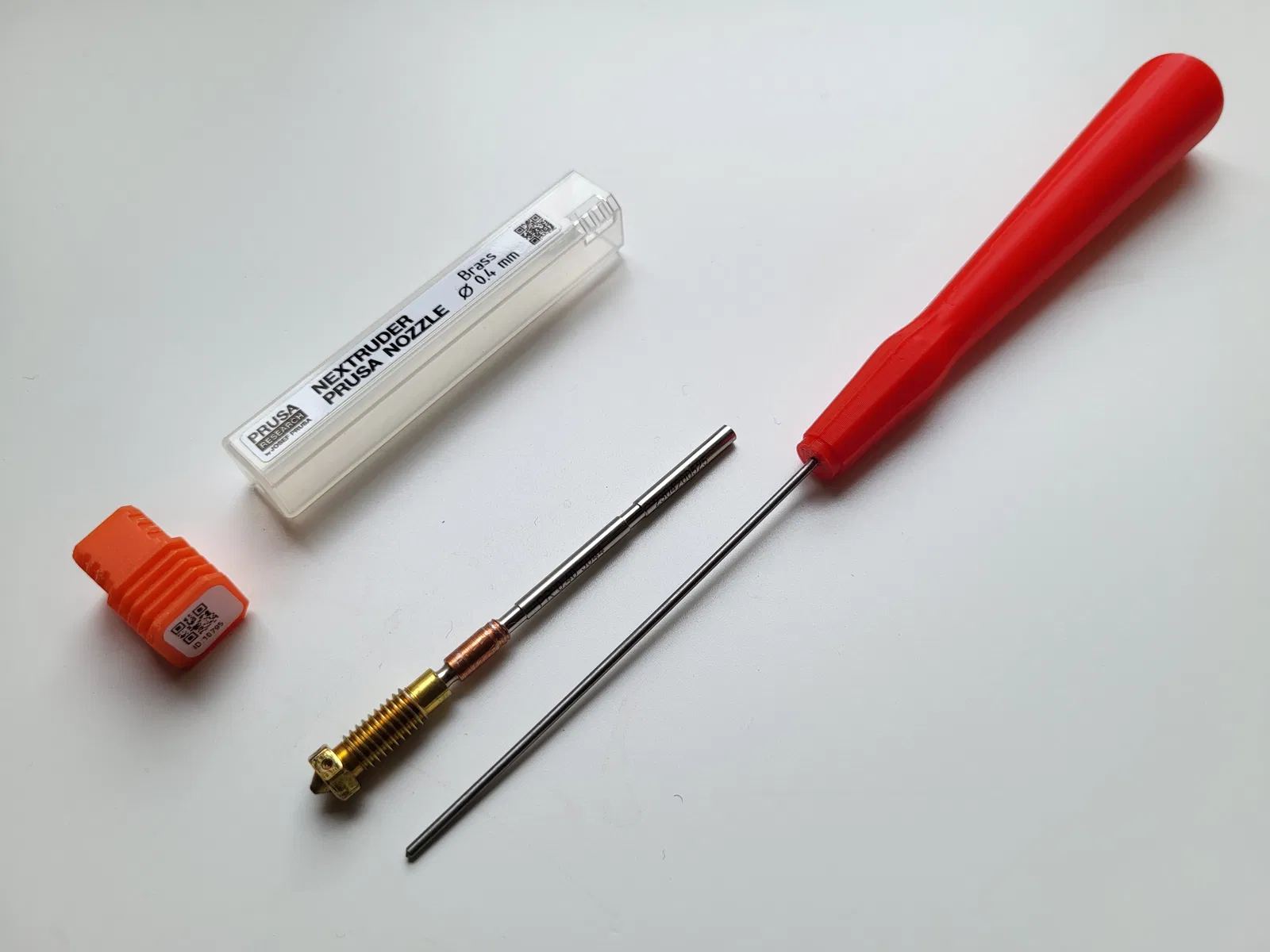 Tay cầm này dùng để thông tắc đầu phun Prusa Mk4 khi đã tháo rời. Kết hợp với cây ty ren 1.5mm x 100mm (đã mài nhọn), bạn chỉ cần ép chặt hoặc nung nóng đầu phun rồi đẩy sợi filament kẹt ra ngoài. Dễ dàng thực hiện tại nhà, vật liệu có sẵn.