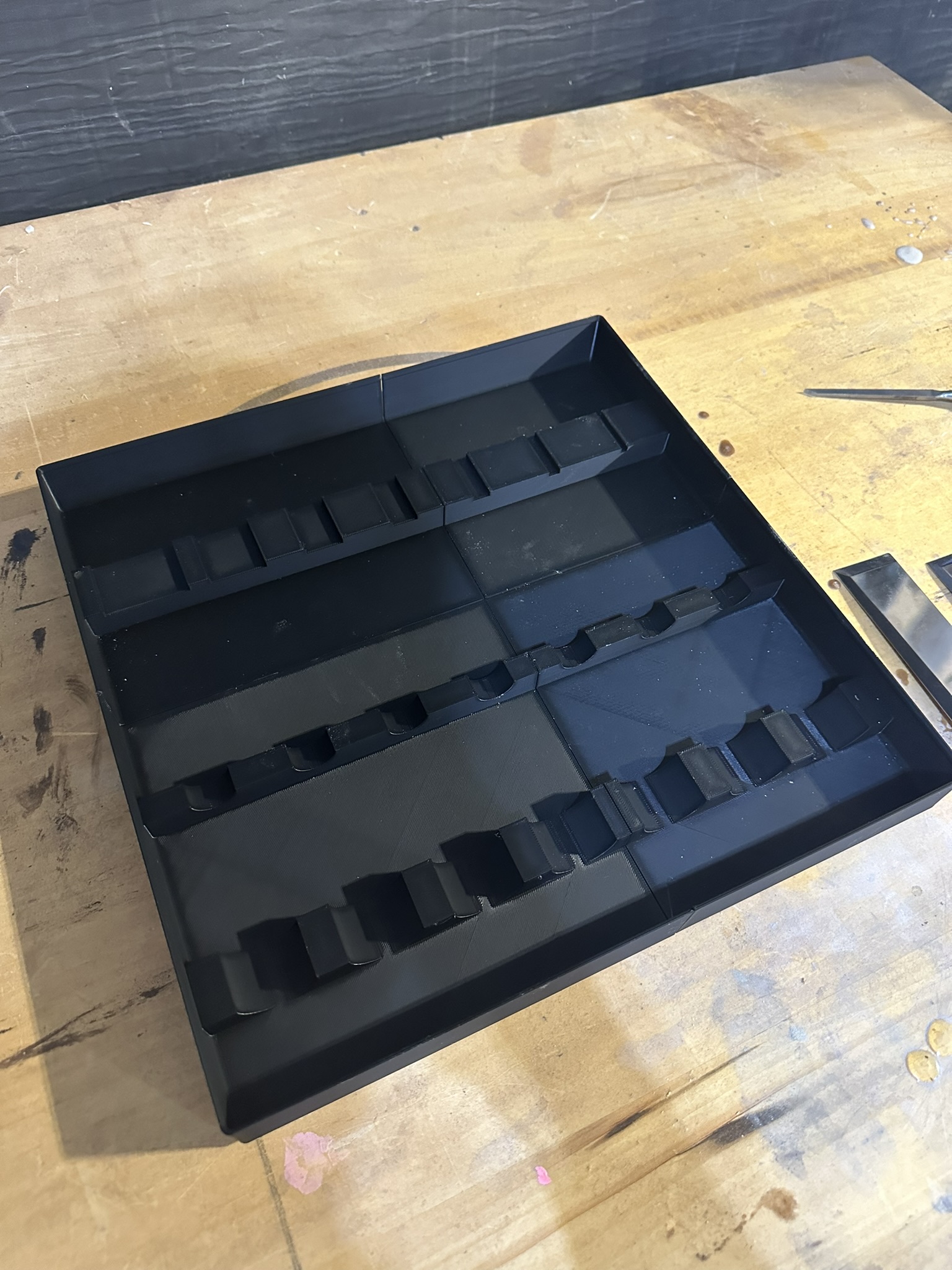 Hộp đựng Dao Narex Richter chuẩn Gridfinity. Chứa bộ 7 dao 1 1/2", 1", 3/4", 1/2", 3/8", 1/4", 1/8". Người dùng tìm giải pháp cất giữ dao trong ngăn kéo và tự thiết kế hộp này theo nền tảng Gridfinity. Mô hình được chia làm 4 phần để dễ in trên máy. In bằng PLA đen với Bambu P1S.