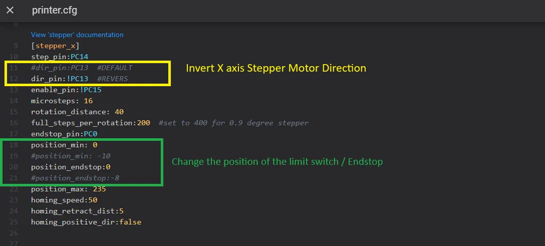 Cách đơn giản nhất là trong file printer.cfg, thay đổi [stepper_x] từ dir_pin:PC13 thành dir_pin:!PC13.