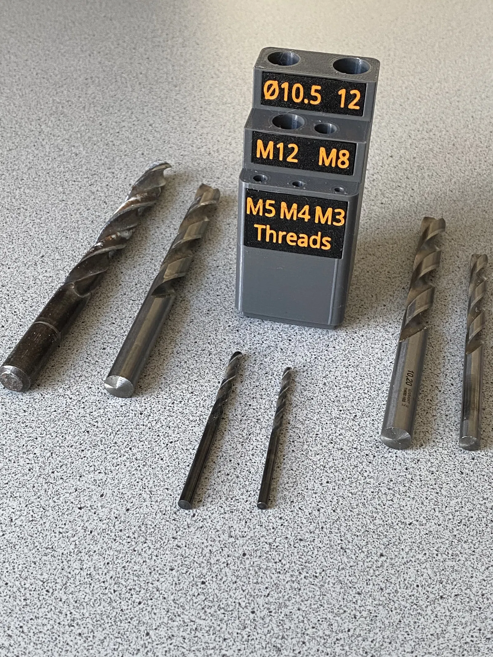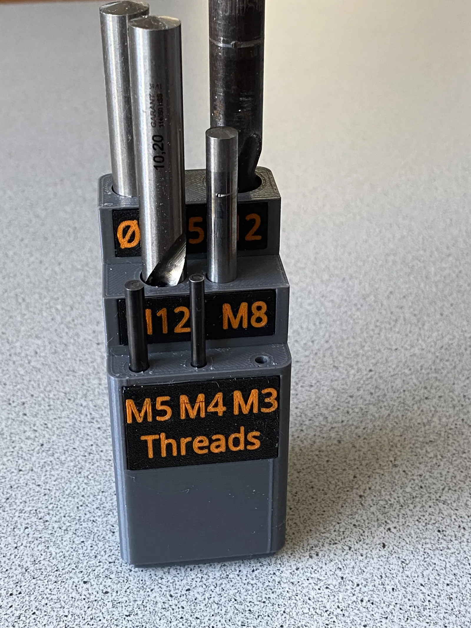 Tôi cần sắp xếp lại hộp đồ khoan lõi của mình, vậy sao không áp dụng hệ thống Gridfinity luôn? Lấy kích thước của các mũi khoan lõi, cộng thêm 0.5mm cho mỗi đường kính để tạo lỗ. Kết quả khá ổn. Sử dụng hộp Gridfinity 1x1, cao 14mm. Đổ đầy đế bằng các tấm đặc, tôi không thích 4 lỗ mỗi tấm. Đổ đầy hoàn toàn hộp Gridfinity. Cắt ra các lỗ cho mũi khoan. Thiết kế ba cấp độ tổng cộng, để tôi có các bậc cho các mũi khoan lớn tương tự. Cố gắng đặt chúng ở độ cao tiện dụng cho mỗi cấp. Làm ba tấm bảng, mỗi tấm cho một cấp độ và ghi rõ mô tả tương ứng của các mũi khoan. Các tấm bảng này bao gồm 3 file STL: tấm đế (màu đen), hai lớp đầu tiên (2x0.2mm) chữ màu (cam), hai lớp tiếp theo (2x0.2mm) cùng chữ, nhưng màu khác (trắng), cho ra tổng cộng 4x0.2mm chữ. Màu thứ hai (trắng) phải tạo thêm độ sáng (ánh sáng) cho bản in. Thiết kế bằng TinkerCad. Các tấm bảng được in bằng máy Prusa MK3S+ với MMU2s của tôi. Tấm đế bằng satin (nguyên bản của Prusa) bằng PLA, với một ít 3DLac. In chi tiết này với mặt chữ úp xuống khay in. Cực kỳ chú ý lớp đầu tiên, in chậm (50-60% tốc độ lớp đầu), không in quá nóng, sử dụng sợi filament hoàn toàn khô. Tôi đã in chữ trước. In chậm, kết quả rất tuyệt vời, đồng ý không? Hộp được in bằng PLA trên máy Prusa MK4 với cài đặt "IS Structural". Sau khi in xong, tôi dùng keo UHU để dán các tấm bảng vừa khít vào vị trí. Khám phá các mô hình in khác của tôi: https://www.printables.com/de/@Tritschi