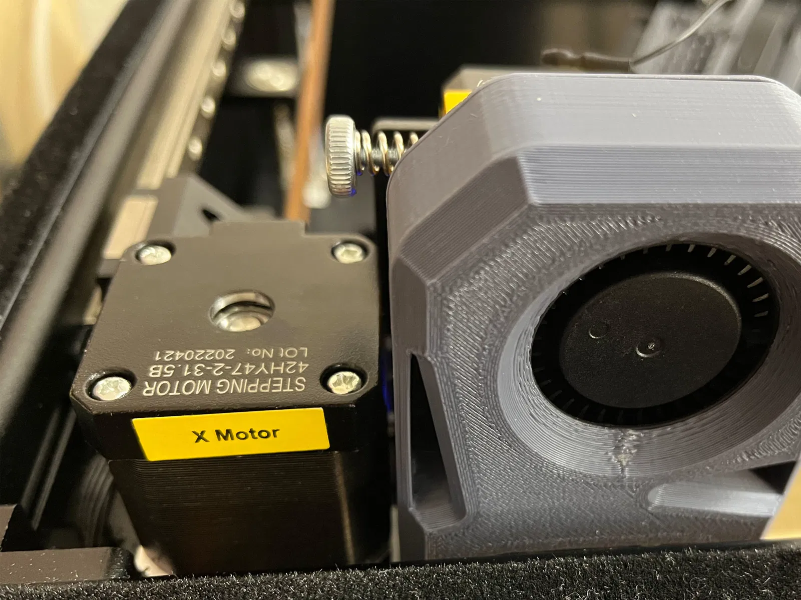 Bước-7: Vặn bộ gắn vào tấm đầu in bằng cách sử dụng các lỗ của khung kim loại quạt ban đầu và với các vít M3 x 8mm. Bước-8: Lắp cảm biến giới hạn X. Bước-9: Lắp bộ tản nhiệt (đừng quên lắp lại ống PTFE).