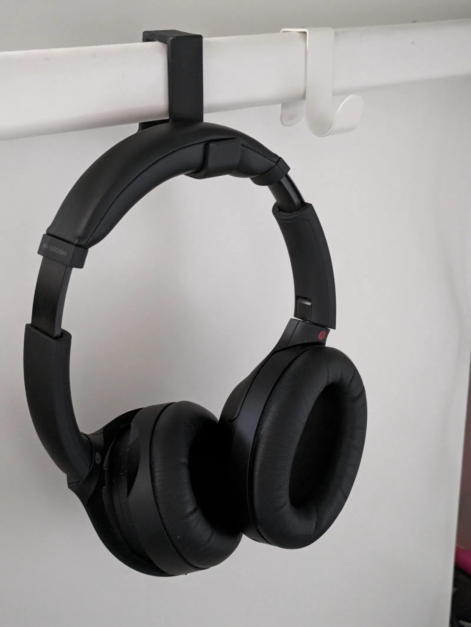 Một cái móc đơn giản dựa trên LÄTTHET của IKEA nhưng rộng hơn một chút. Nó vừa với dây đeo tai nghe Sony WH-1000XM4.