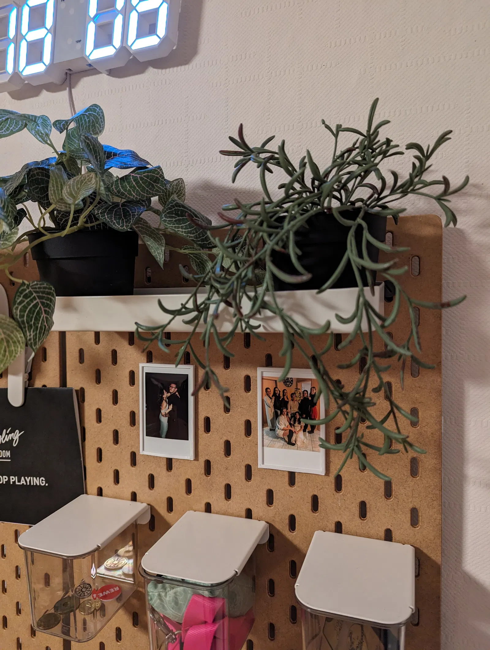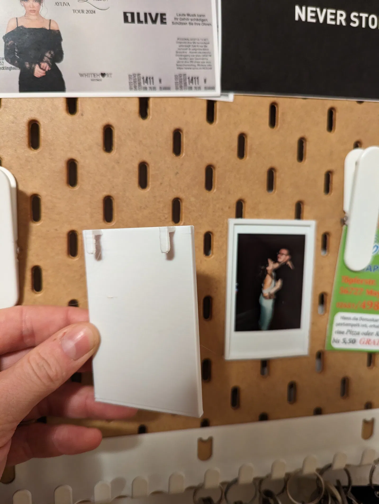 Một khung nhỏ vừa với ảnh Polaroid, gắn lên tường Ikea Skadis bằng kẹp để có thể thay đổi ảnh.