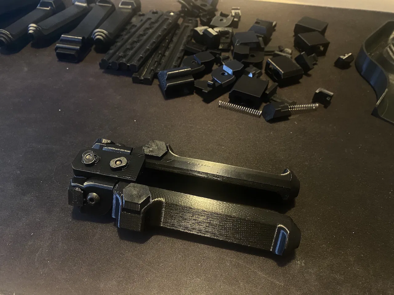 Tôi đã dựa trên thiết kế này một cách tương đối từ các bipod của Magpul nhưng có một vài điểm khác biệt đáng chú ý. Tôi đã ưu tiên sự nhỏ gọn, vì bipod này được dự định sử dụng trên một khẩu súng hơi có thể gập lại.