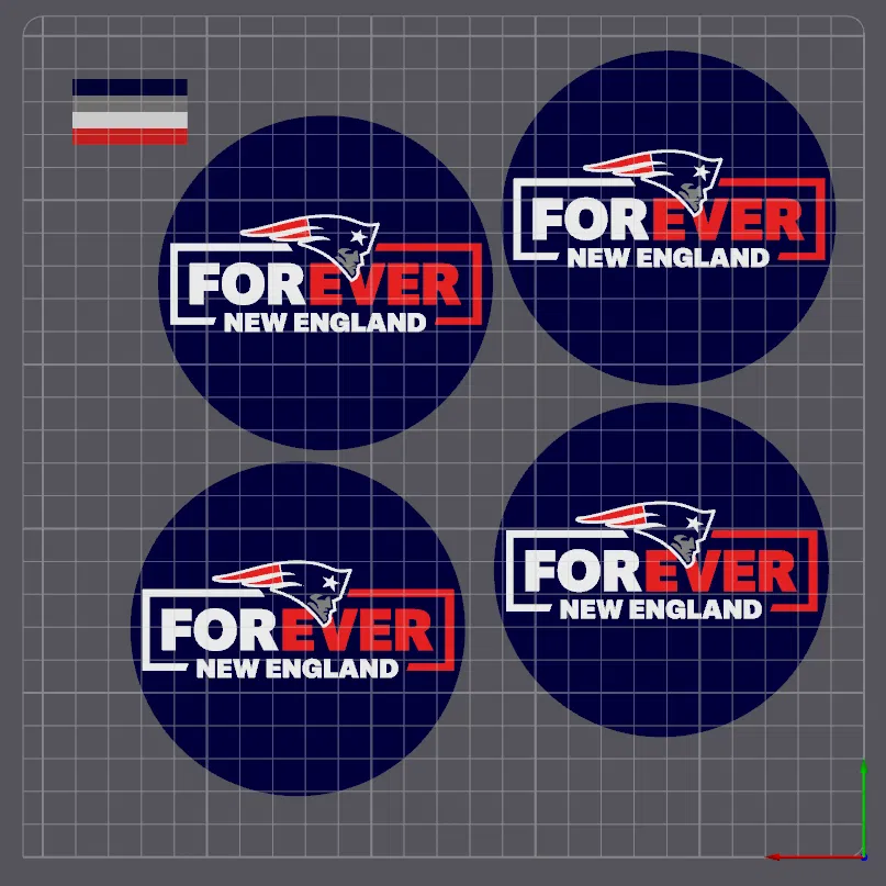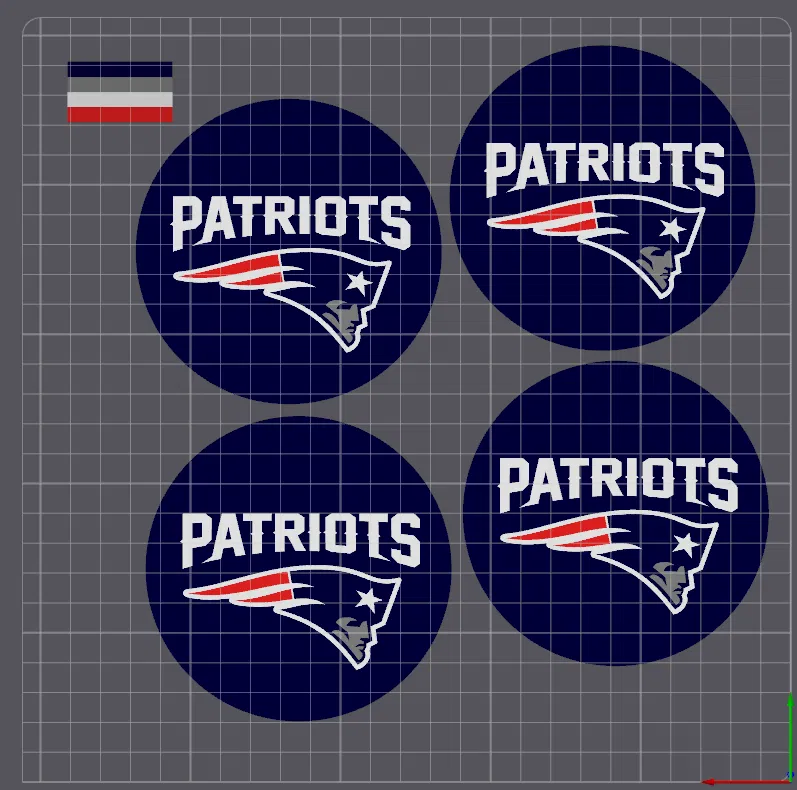 Tui tạo ra hai mẫu đế lót ly lấy cảm hứng từ đội New England Patriots này. Mỗi mẫu cần 4 màu và tốt nhất là nên có hệ thống AMS để việc đổi màu dễ dàng hơn. Mấy cái này tui in bằng máy Bambu X1C sử dụng PLA màu Đen của Bambu, PLA màu Trắng Mờ của Bambu, Xám mờ của Polymaker, và Xanh Navy của PolyTerra. Rất khuyến khích anh em xài tấm PEI nhám nha, vì mấy mẫu này úp mặt xuống in nên nhìn đẹp lắm.