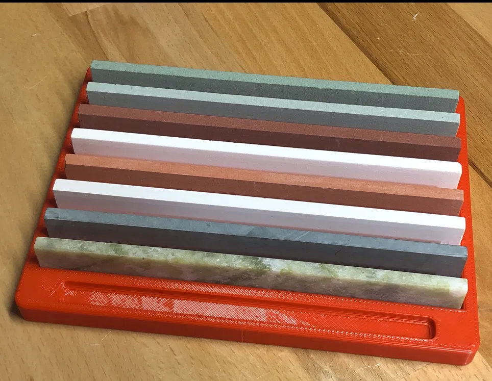 Đá mài dao thường được cuộn trong bong bóng. Mình đã thiết kế một cái khay nhanh để đựng chúng. In bằng PLA, rất tiện lợi, có file FreeCad để bạn tùy chỉnh kích thước và số lượng đá.