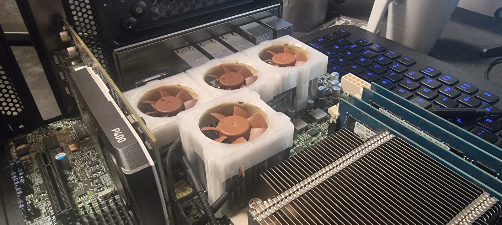 Giá đỡ 40mm tùy chỉnh cho quạt Noctua, phù hợp với bo mạch chủ Supermicro X10SLH-N6-ST031. Bản in từ PETG hoặc vật liệu chịu nhiệt khác để đảm bảo độ bền. Thiết kế có tính đến các linh kiện và dây cáp.