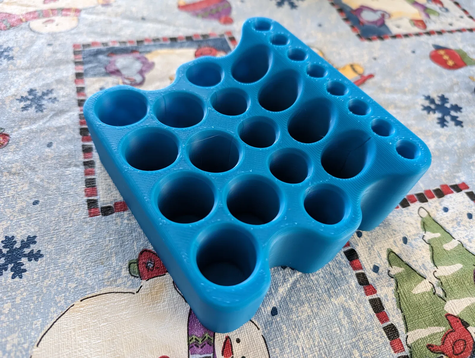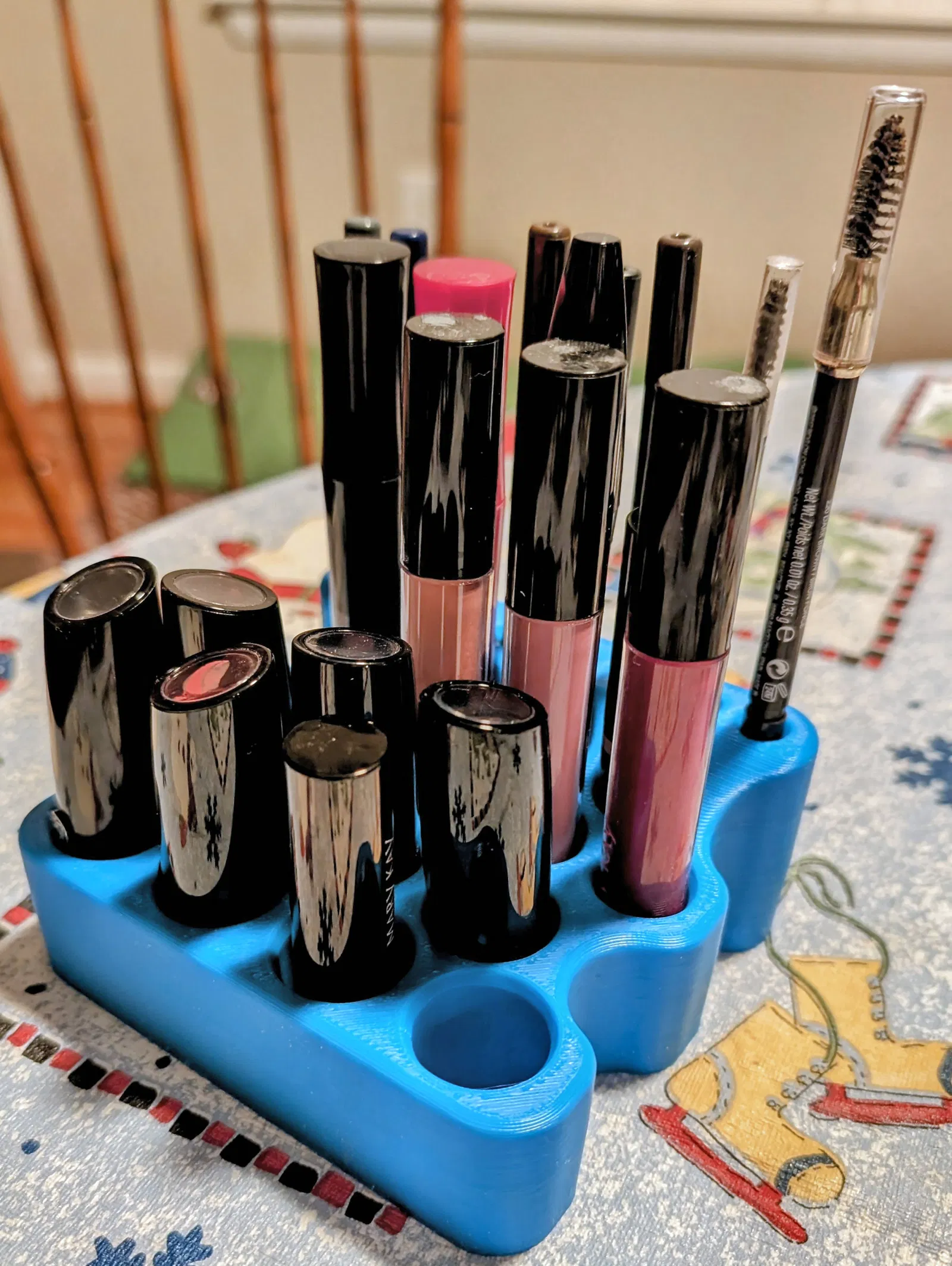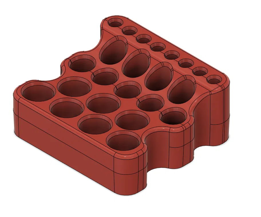 Mẫu này in rất dễ. Mình có dùng cài đặt variable layer height trong PrusaSlicer và thấy nó làm cho sản phẩm đẹp hơn. Các lỗ tròn cho mỗi hàng có kích thước khác nhau cho các món đồ trang điểm khác nhau.