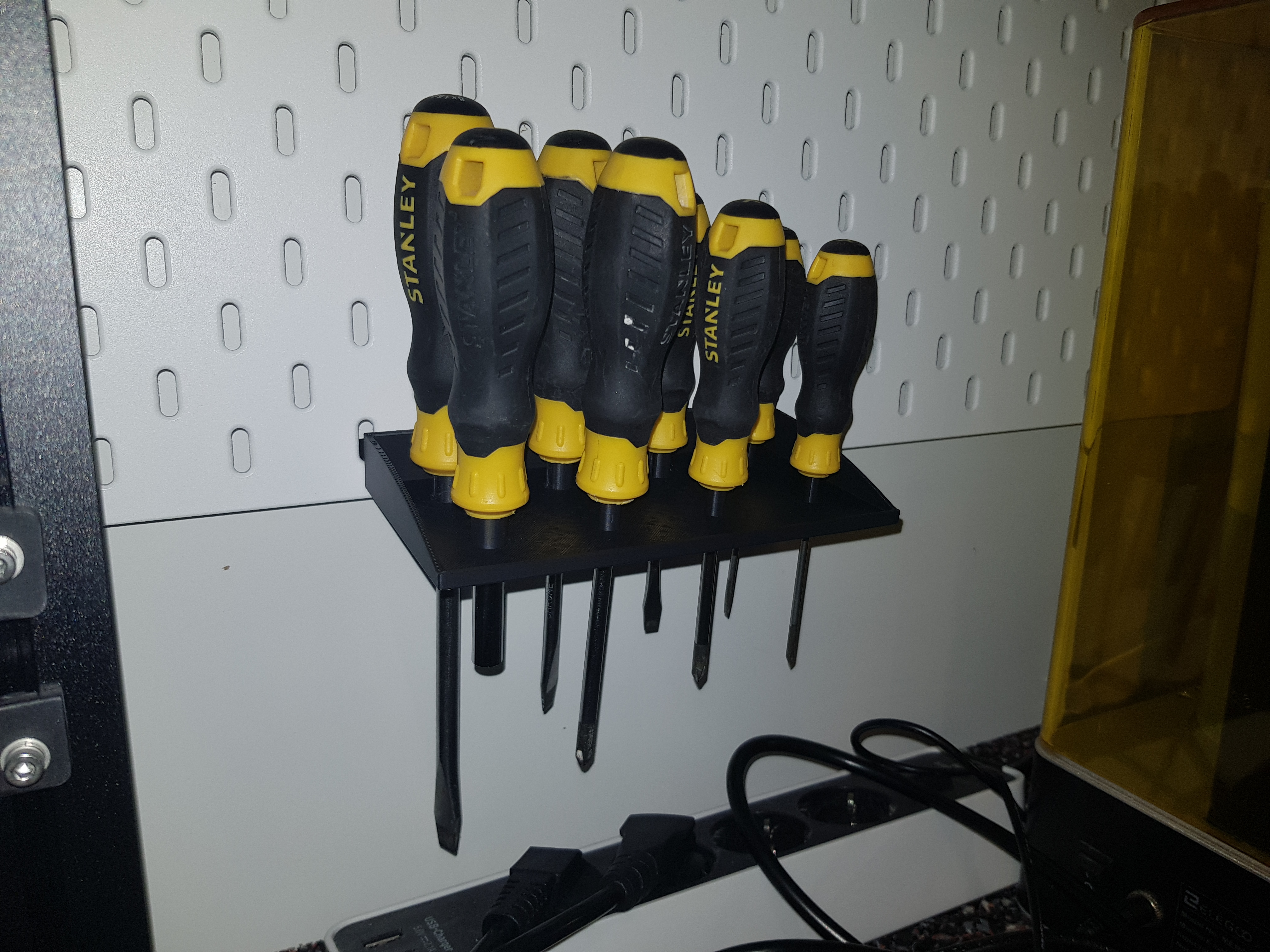 Cái kệ nhỏ gắn vô SKADIS để cắm mấy cây tua vít thường, làm bằng Fusion 360. In bằng PLA, 15% Infill, không cần đục, không cần gì hết trên FLSUN V400. Có thể hữu ích cho ai đó.