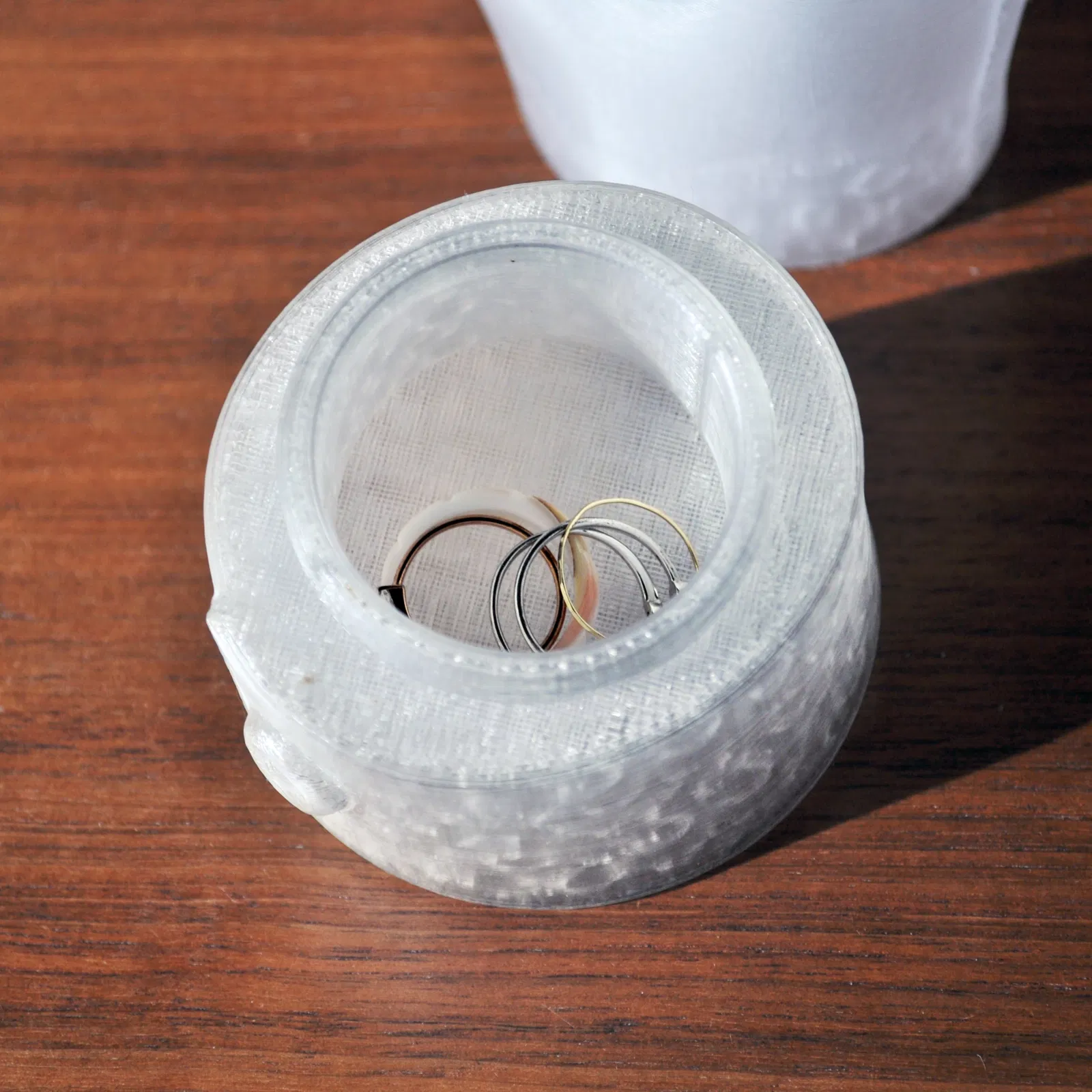 Mẫu này in không cần thêm bất kỳ bộ phận hỗ trợ nào và bạn xem file 3MF có sẵn đường nối được sơn sẵn luôn nha. Mình chọn kiểu dáng một màu với chất liệu Clear Polylite PETG của Polymaker, để nhẫn trở thành tâm điểm, tuy nhiên, bạn có thể cân nhắc phối nhiều màu vì phần tay và cổ tay áo là hai bộ phận riêng biệt.