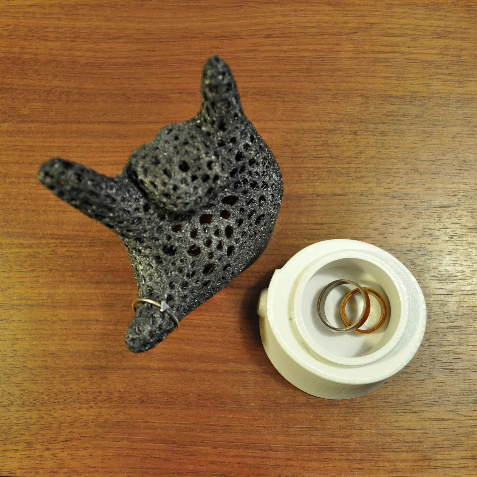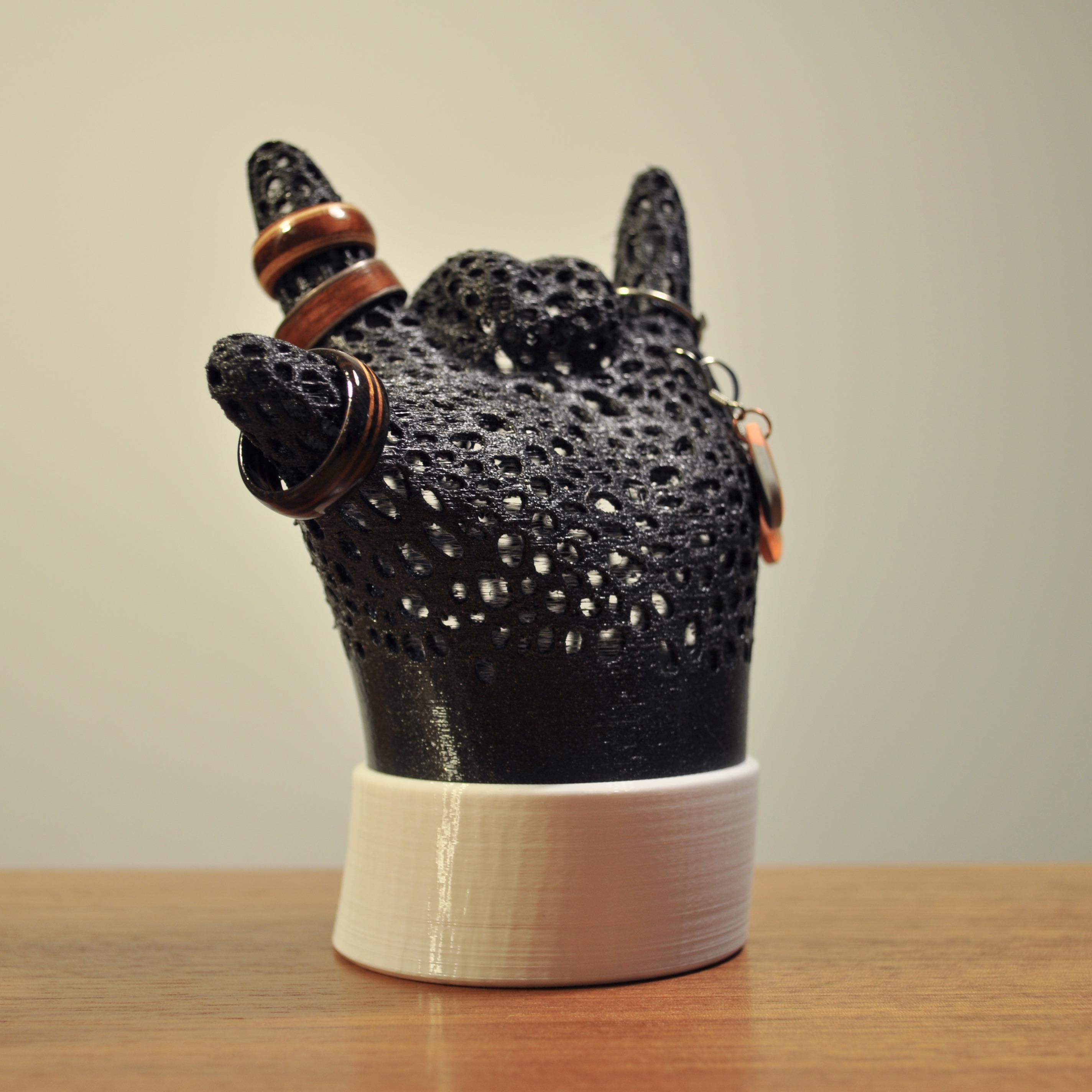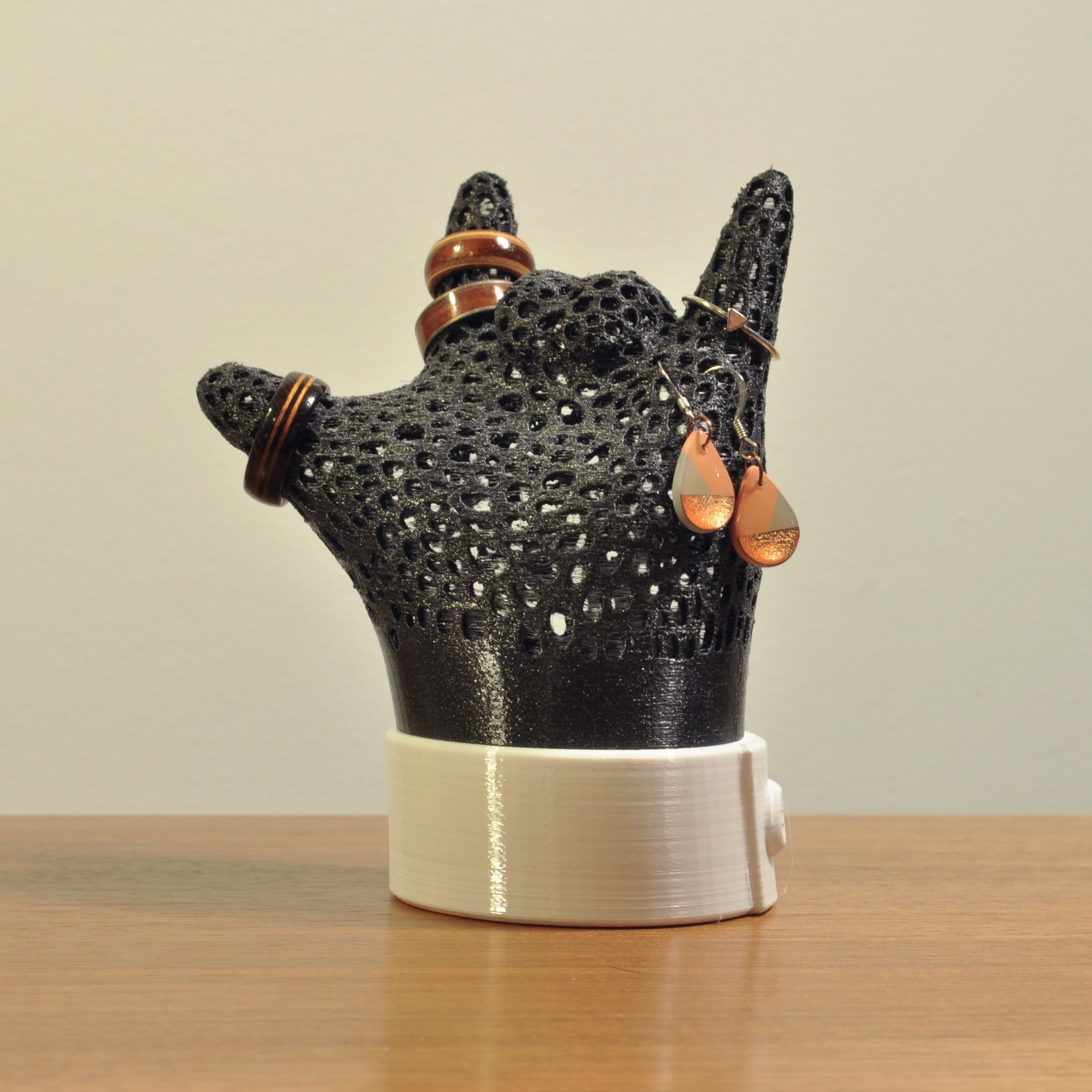 Cái chỗ đựng nhẫn hình bàn tay "I Love You" họa tiết voronoi này cưng lắm nè! Dùng để đựng nhẫn, diễn tả tình yêu qua ASL, treo bông tai. In không cần hỗ trợ, có file 3MF kèm hỗ trợ hữu cơ tùy chọn.