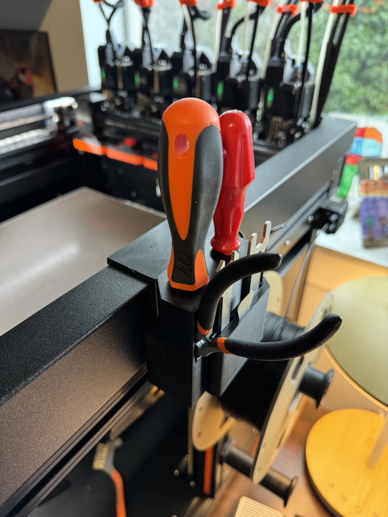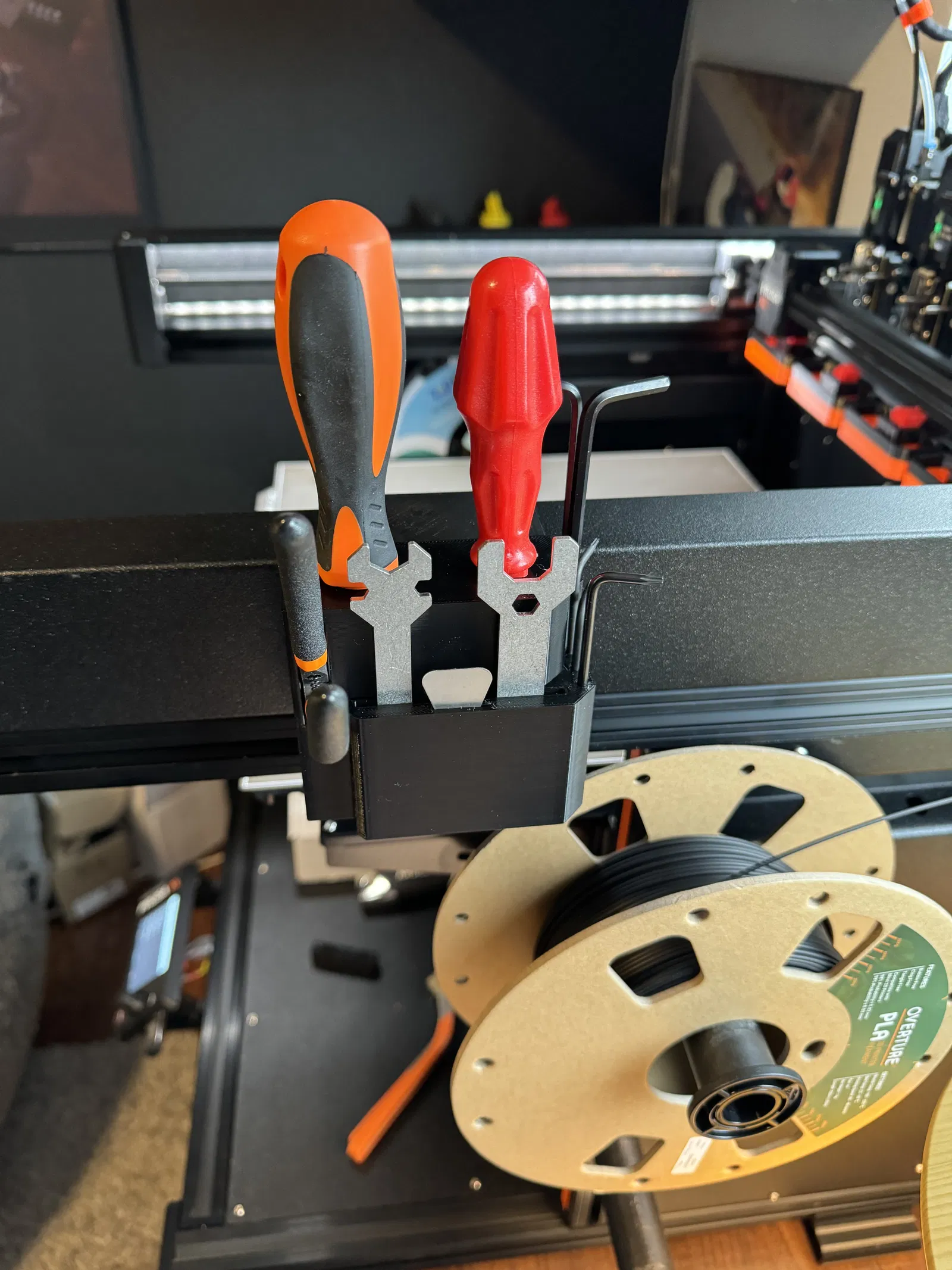 Tui muốn treo cái chỗ để đồ zin của máy ở bên hông cái Prusa XL. Móc treo này giúp bạn tận dụng không gian và giữ cho dụng cụ luôn gọn gàng, dễ lấy.