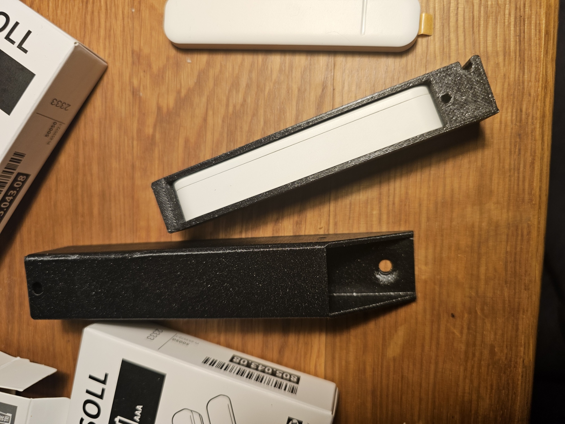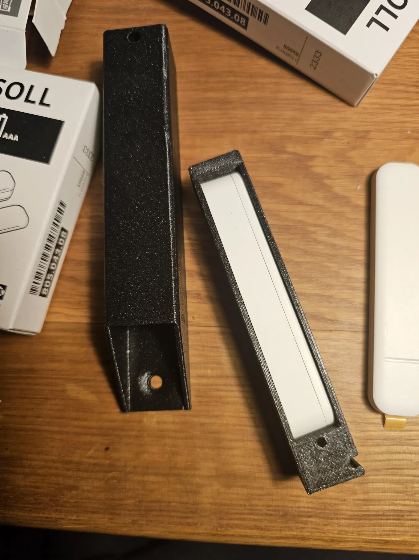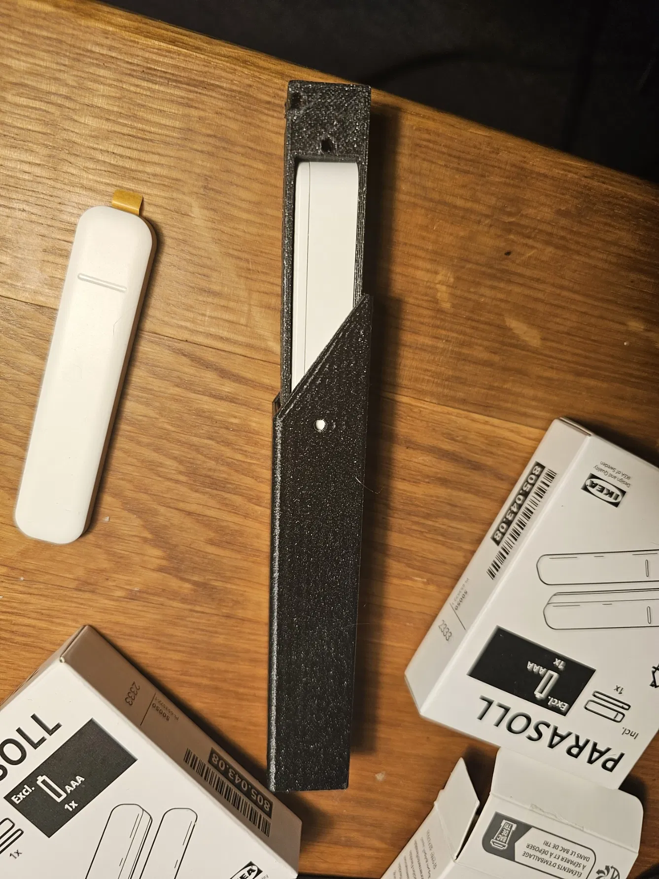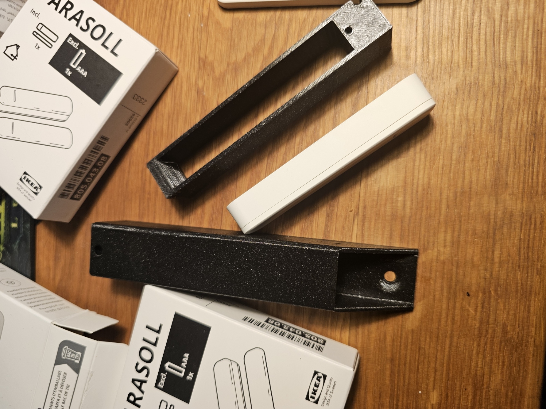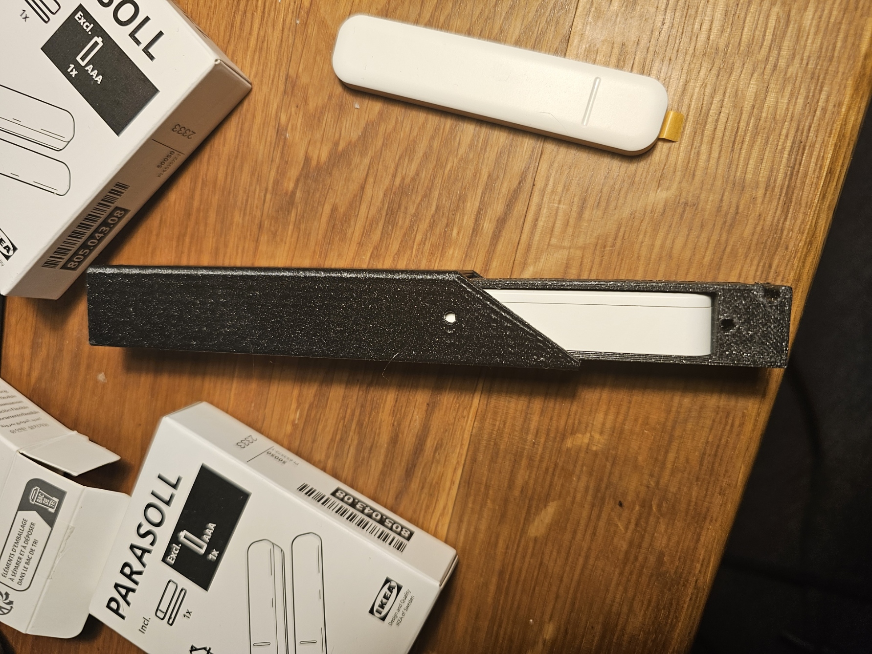 Cần một vỏ bọc chống chịu thời tiết cho cảm biến cửa IKEA Parasoll để gắn ngoài trời. Vật liệu gợi ý là PETG, ASA, ABS. Không cần support nhưng nên có brim 4mm. Có thể gắn bằng băng keo hoặc vít 4mm. Có thể cần chà nhám hoặc phóng to nếu độ khít cao.