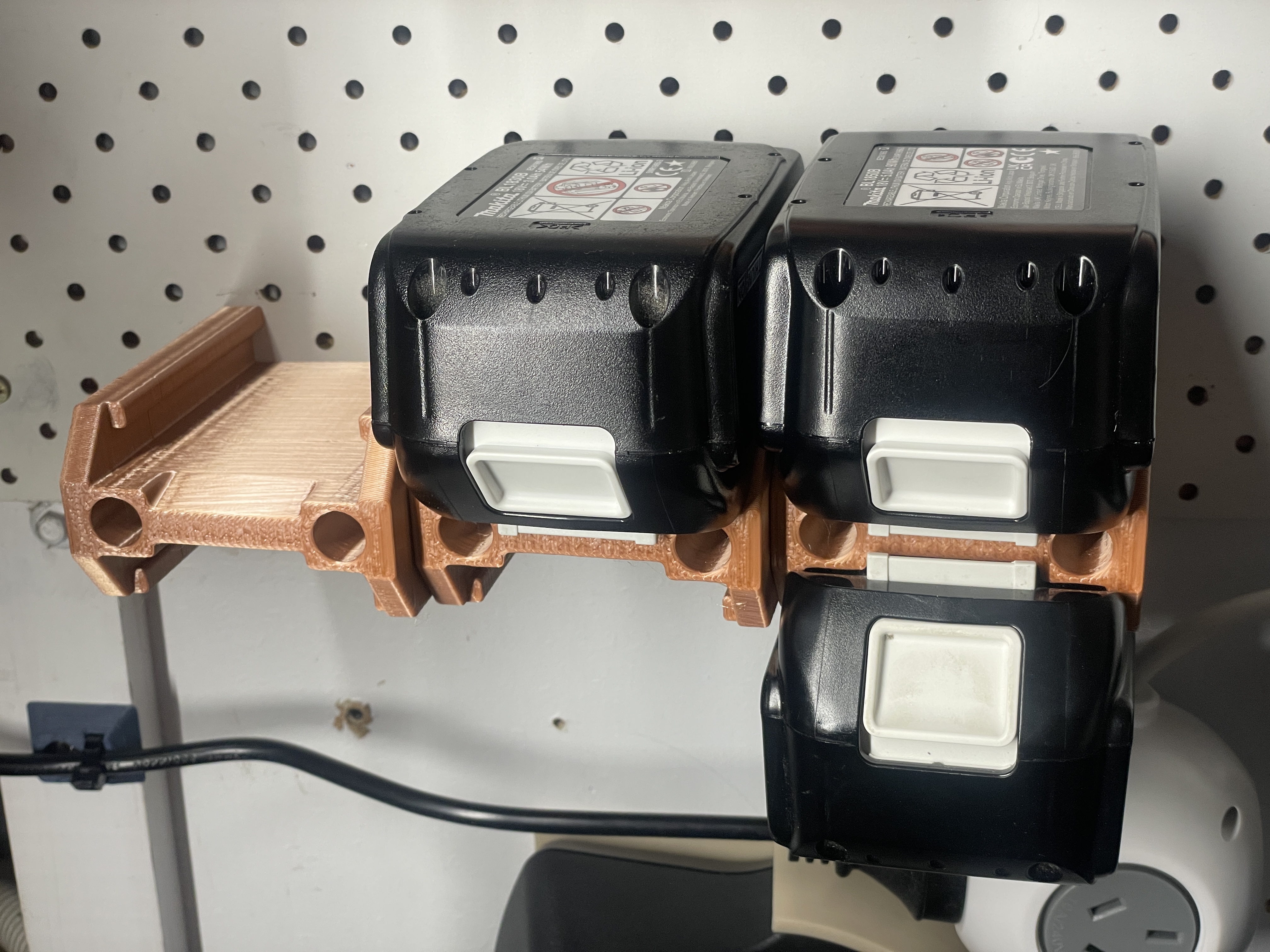 Giá đỡ pin Makita 18V xếp chồng đôi. Lưu trữ pin gọn gàng, hoặc phân vùng pin đã sạc/chưa sạc. Phù hợp cho việc treo tường hoặc tổ chức không gian lưu trữ pin Makita.