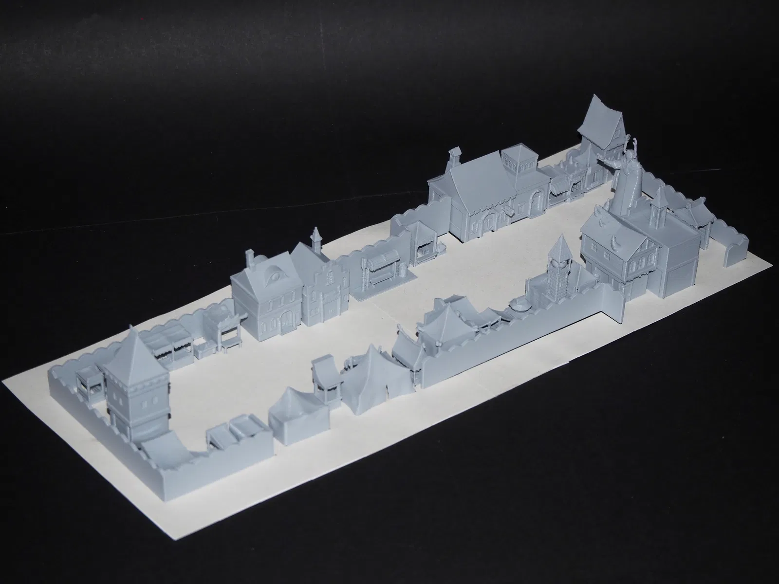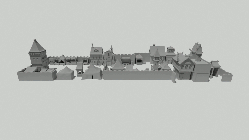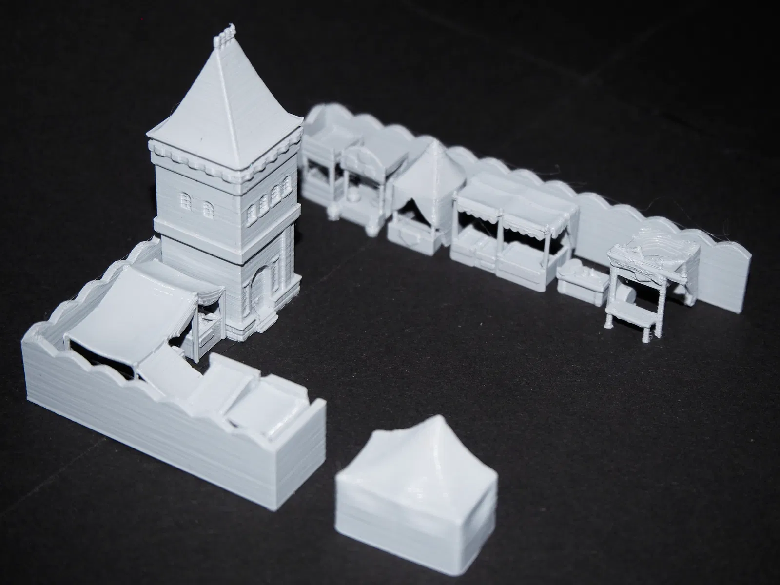Mô hình này bao gồm 10 quầy hàng, 1 tòa nhà và bức tường xung quanh.