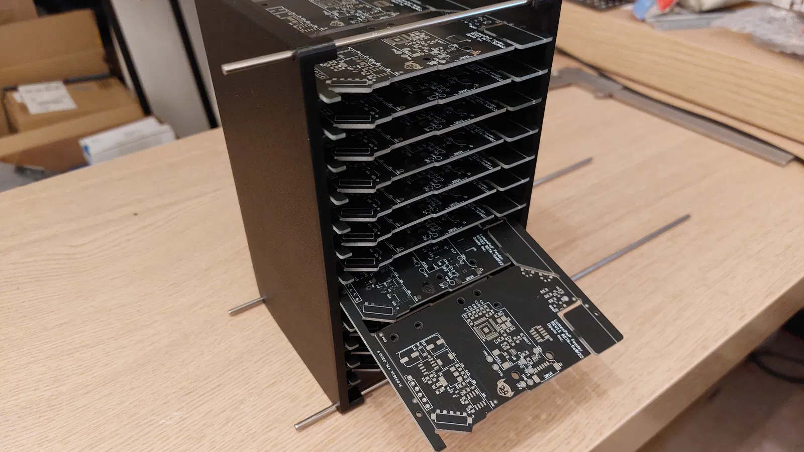 Giá đỡ PCB khá cơ bản để lưu trữ các bo mạch trong và sau khi lắp ráp, lấy cảm hứng từ các tạp chí bo mạch kiểu công nghiệp.