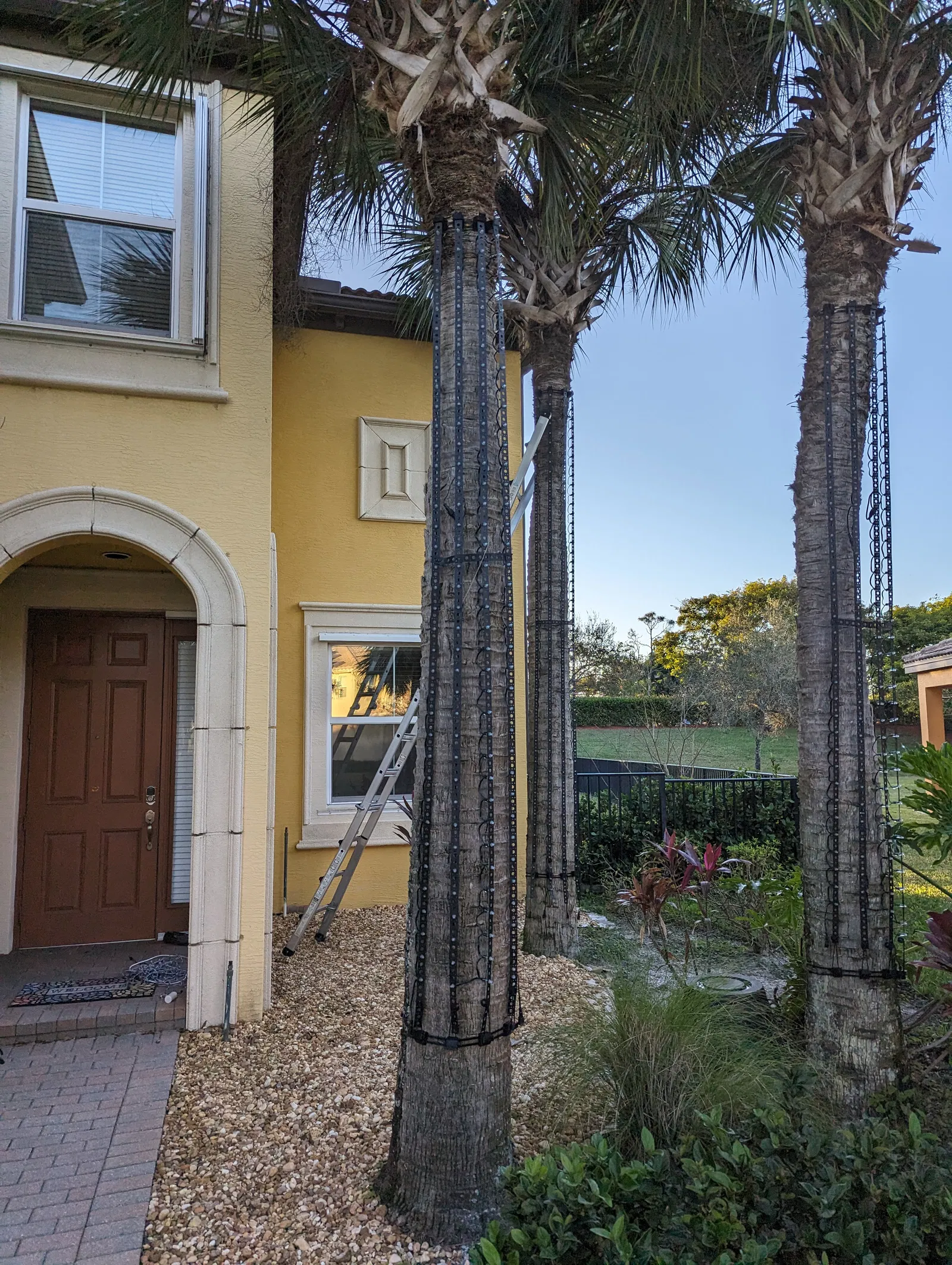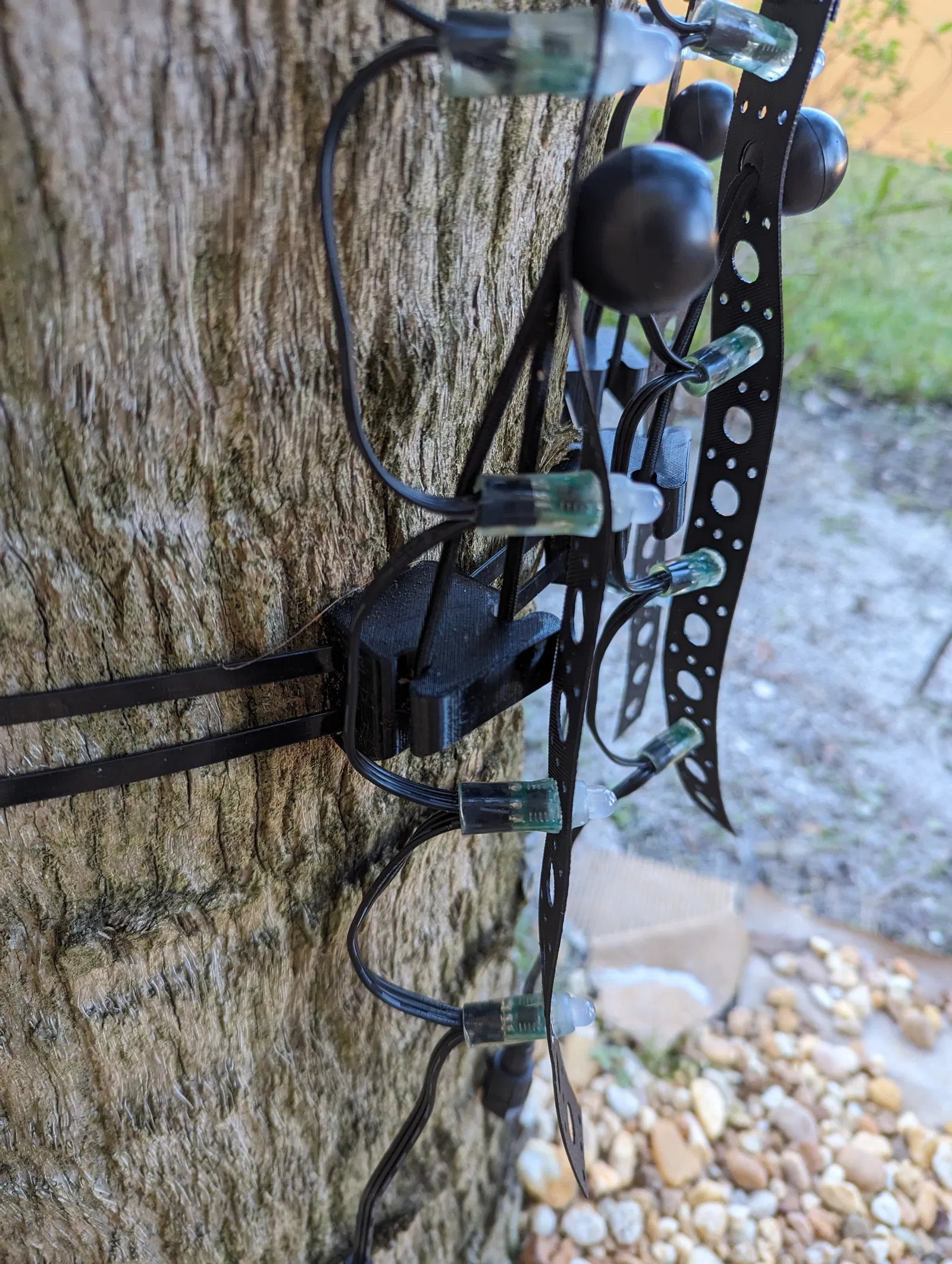Mấy cái đế này có thể gắn vô thân cây bằng dây rút lớn ha. Rồi mình treo mấy cái dải đèn pixel lên bằng cách luồn dây lên qua đế, làm một cái vòng nhỏ ngay chỗ dải đèn, rồi xài dây rút nhỏ để cố định cái vòng lại. Tui cũng có làm thêm một cái STL khác cho đế tương tự ở dưới đáy dải đèn, cái này xài dây thun có bi để giữ cho dải đèn căng nha.