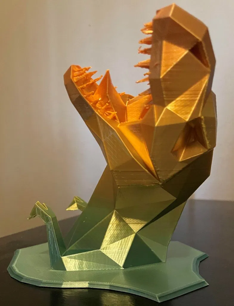 Mô hình T-Rex low-poly độc đáo được ghép từ các bộ phận, in trên bảng trang trí. Thích hợp cho máy Creality Ender 3 Pro, sử dụng PLA cầu vồng và supports. Tải file STL về và bắt đầu in ngay!