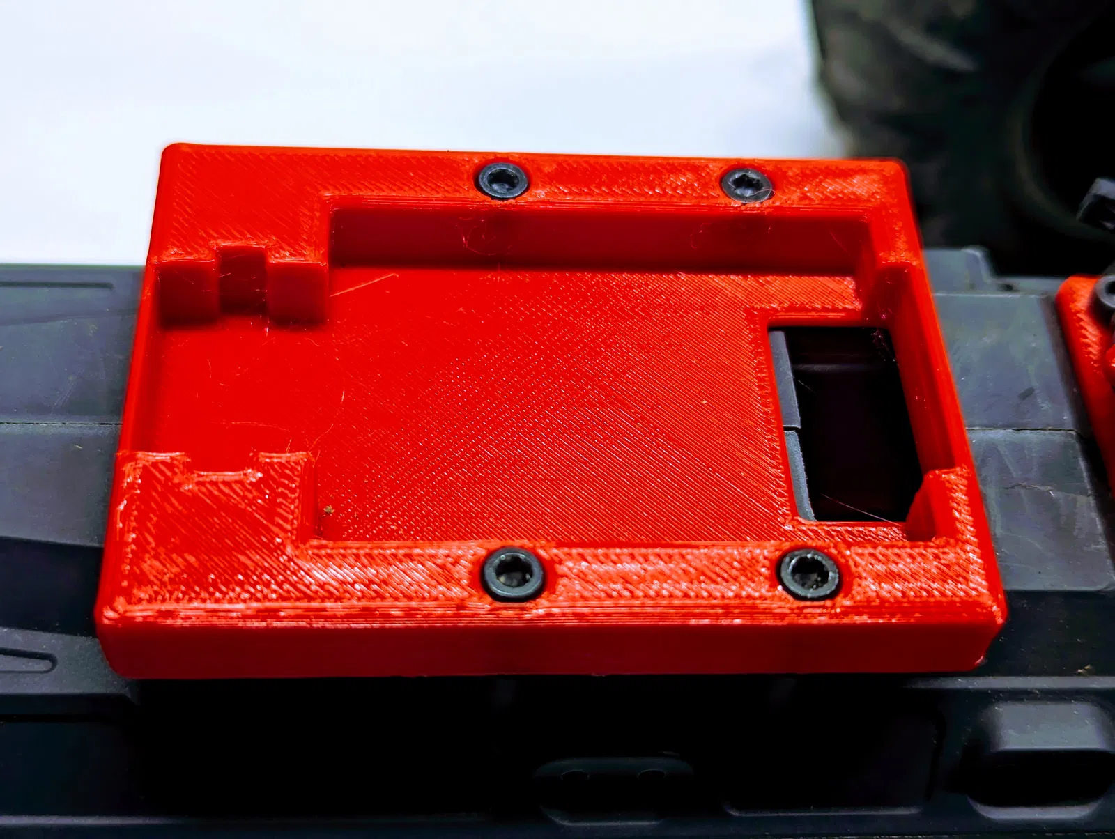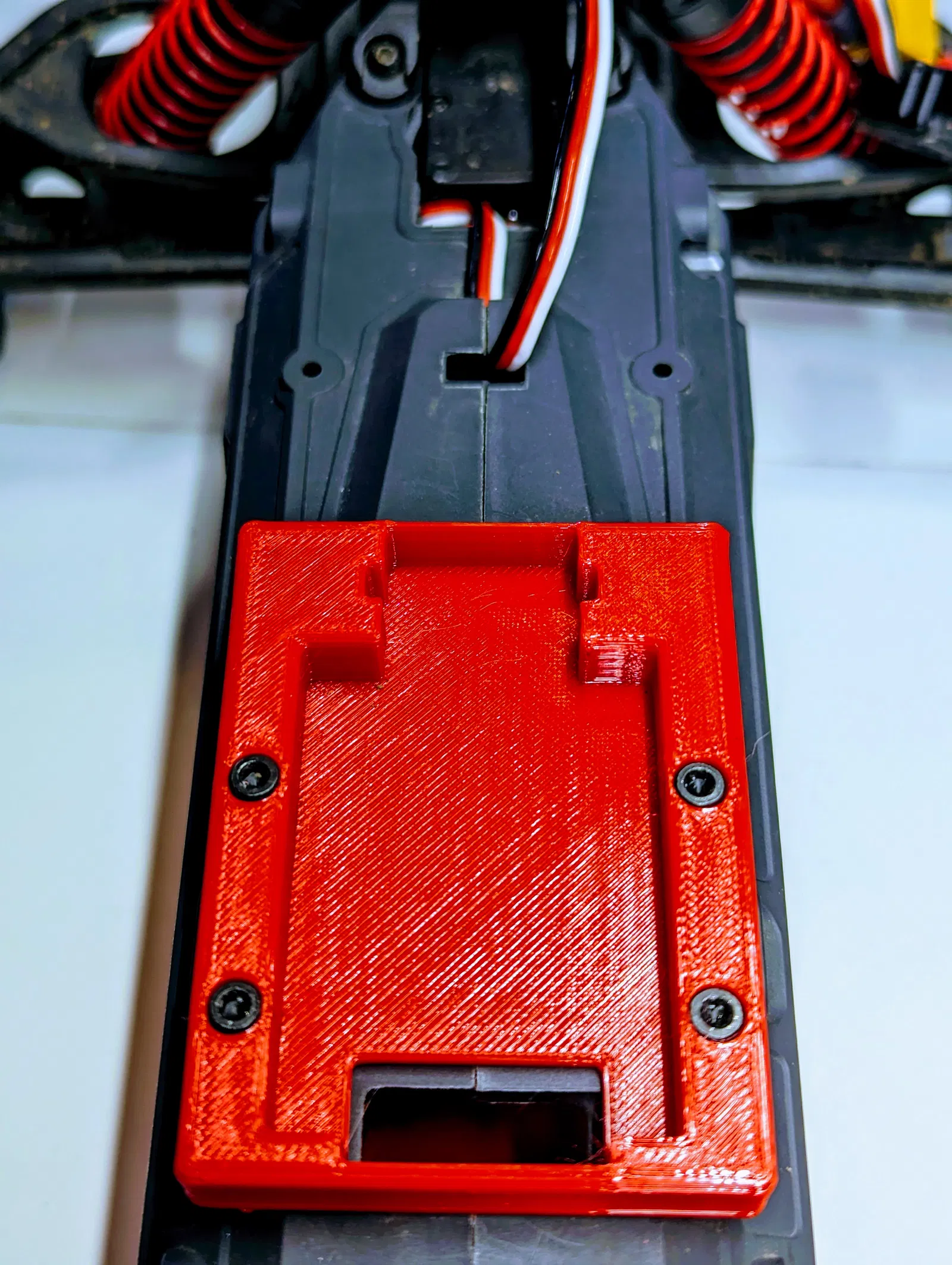 Sử dụng các lỗ gắn có sẵn cho ESC, đế này sẽ cho phép gắn Hobbywing QuicRun 10BL120G2 vào vị trí zin. ESC 10BL120G2 sau đó sẽ được "ép vừa" vào đế, và mình thấy nó khá ổn mà không cần dùng keo để giữ. Nếu bạn hay chơi "trâu bò" thì nên thêm một ít băng keo hai mặt dưới ESC để đảm bảo nó được cố định chắc chắn hơn.
