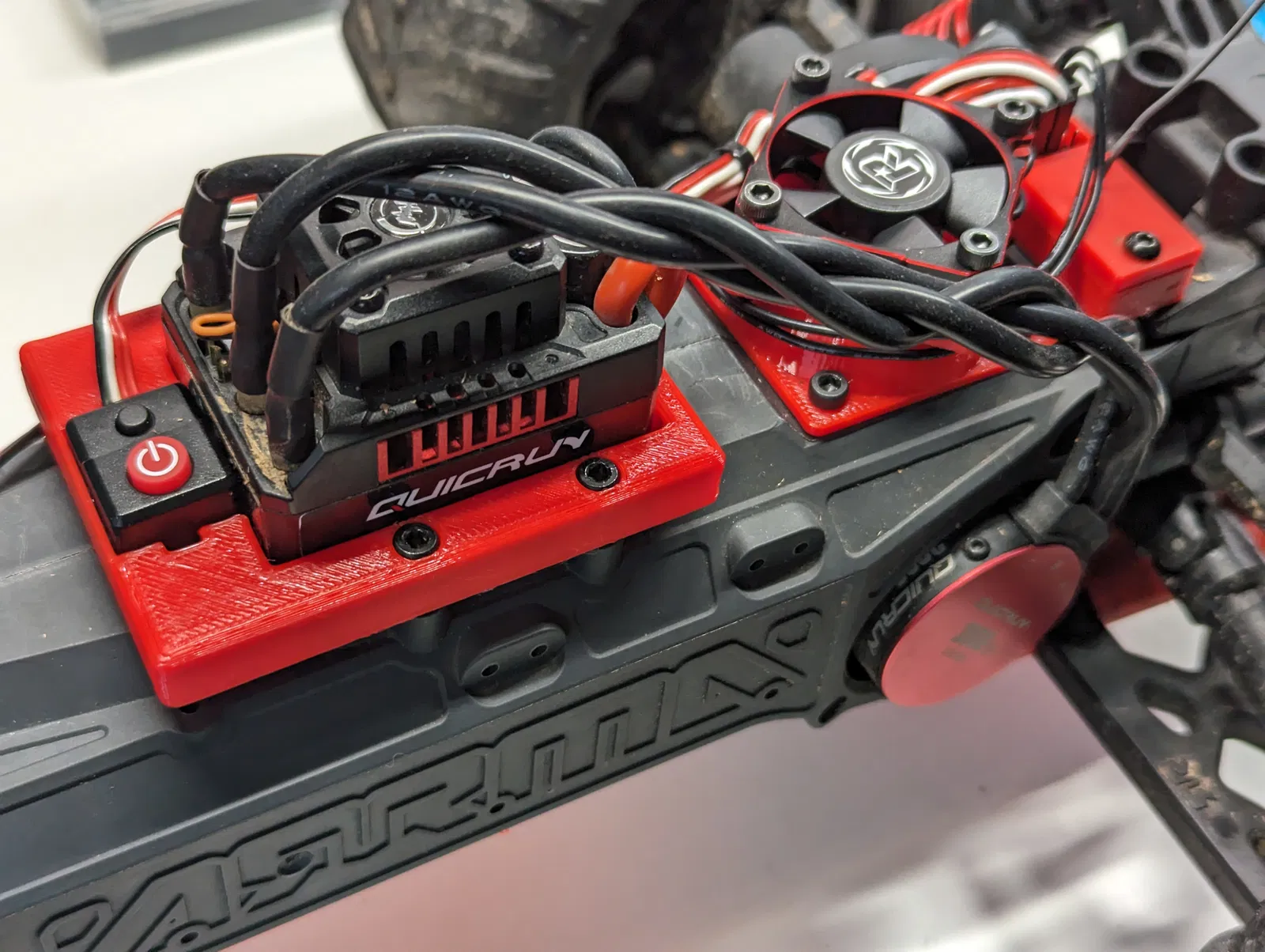 Đế gắn ESC Hobbywing Quicrun 10BL120G2 cho Arrma Gorgon, sử dụng lỗ gắn zin, giữ ESC chắc chắn và có chỗ gắn nút nguồn gọn gàng. Chất liệu PLA, STL tải về.