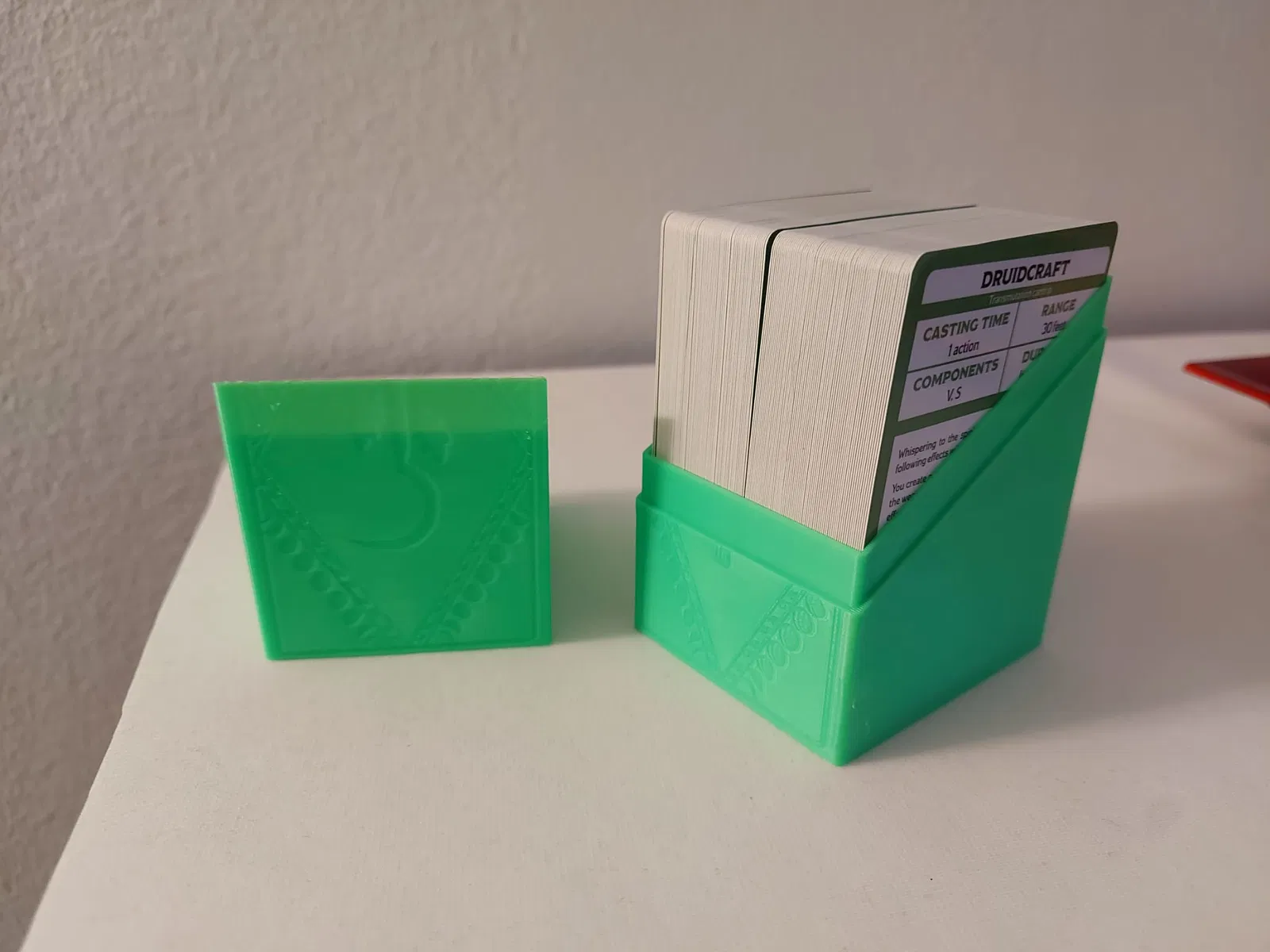 Hộp đựng thẻ phép thuật D&D 5e làm bằng nhựa, thay thế cho hộp giấy thông thường. Có file STL cho druid và file .fd3 để tùy chỉnh cho các lớp khác hoặc mọi loại thẻ. Thiết kế hộp có thể tùy chỉnh dễ dàng.