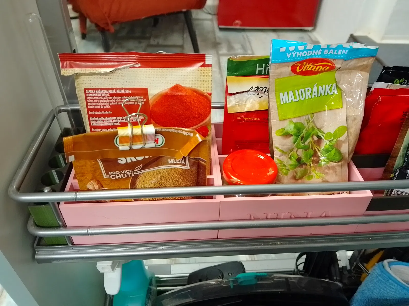 Hộp đựng túi gia vị có tên Nina trên đó. Có hai phiên bản ở đây.