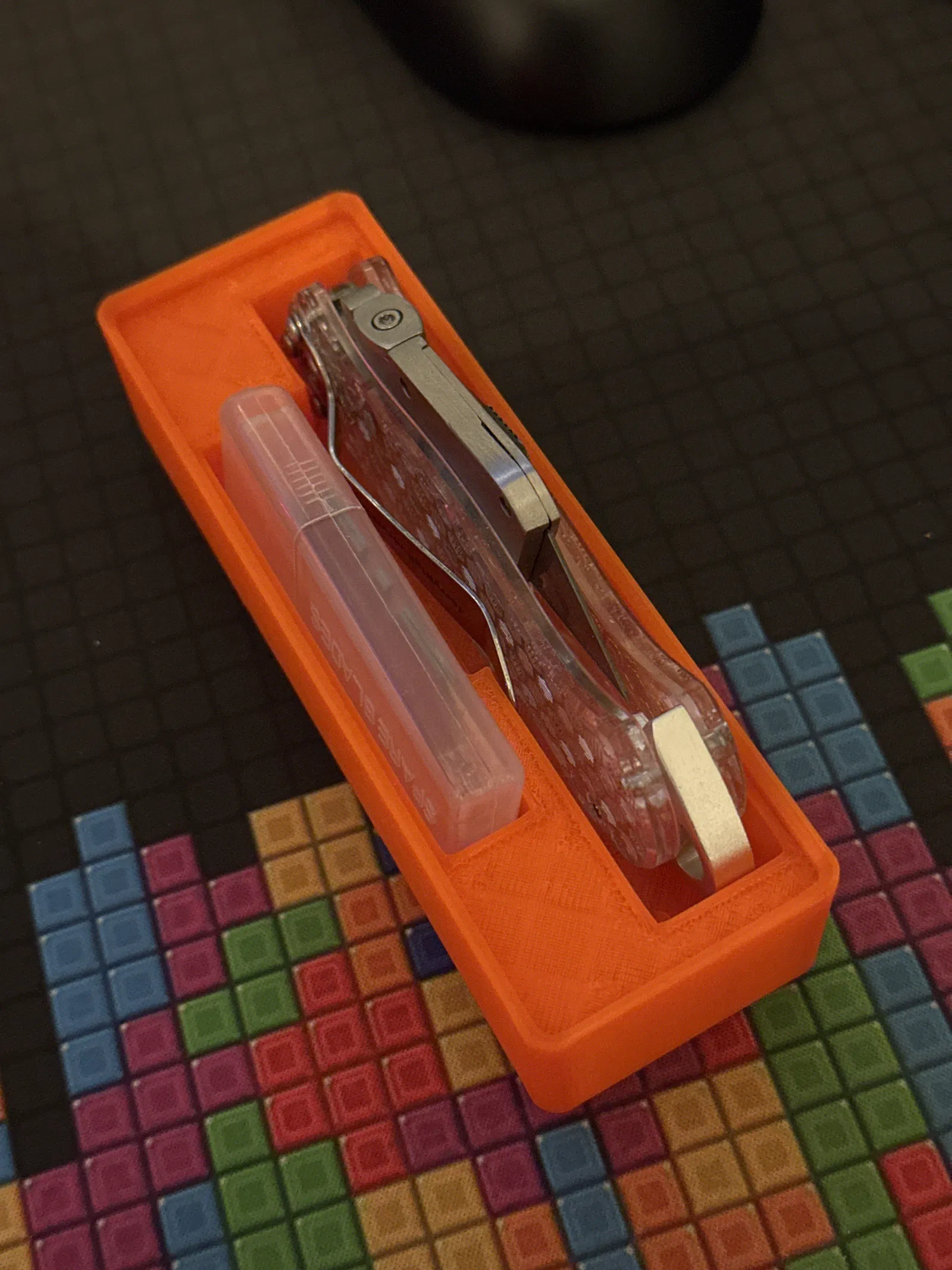 Cái đế Gridfinity 3x1 này để đựng Dao cạo JerryRigEverything và cái hộp nhựa nhỏ đựng lưỡi dao dự phòng. Phiên bản remix này có thêm không gian cho phiên bản trong suốt nha, giúp bạn lấy dao và lưỡi dao cực kỳ tiện lợi.