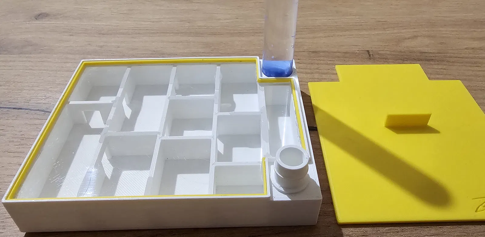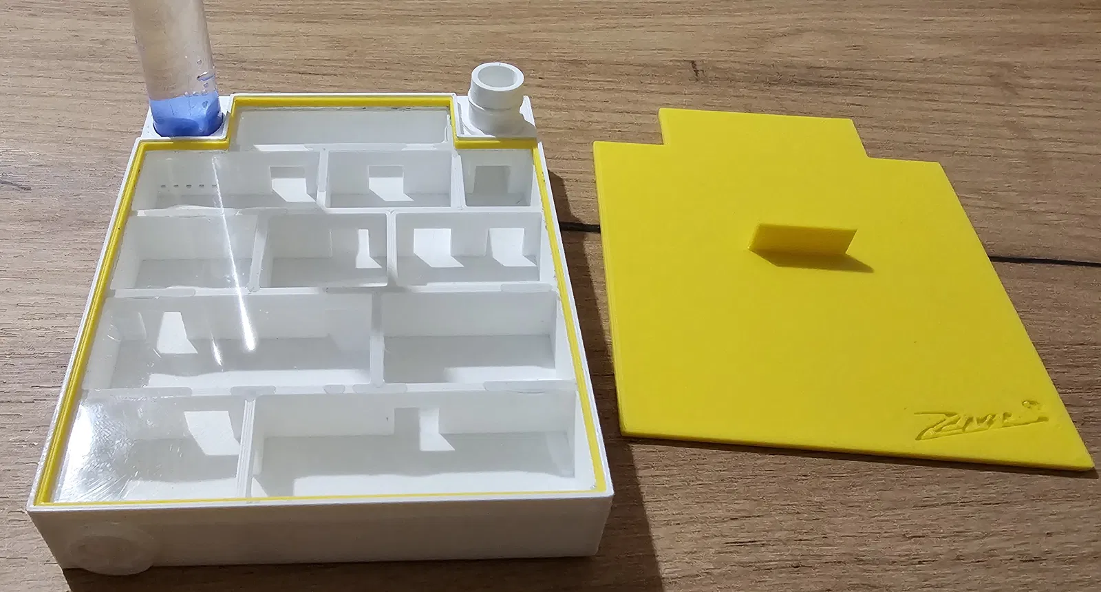 Thiết kế tổ kiến cho formikarium, có hệ thống tưới nước, phù hợp ống nghiệm fi16 và ngăn thông gió. Lối vào và lối ra phụ đều có ống nối fi12, cho phép mở rộng dễ dàng trong tương lai. Thiết kế này dựa trên quan sát hành vi kiến nuôi trong nhiều năm.