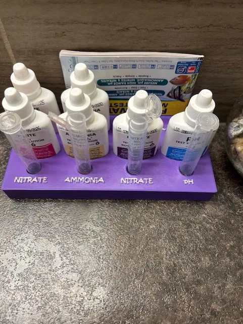 Con trai tui đang chuẩn bị bể mới để nuôi cá, mà mấy chai lọ với ống nghiệm test nước của nó cứ vứt lung tung hết trong nhà tắm. Mẹ nó nhờ tui làm cái chỗ để gọn gàng hơn cho sạch sẽ. Tui nghĩ đây là bộ test phổ biến nên có lẽ mấy anh em khác cũng cần xài.