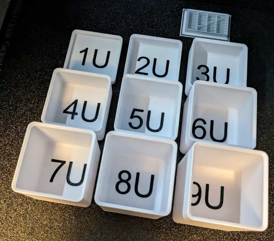 Hộp Gridfinity 1x1 cao từ 1U đến 13U, có chữ ghi rõ chiều cao bên trong và dưới đáy hộp. Dành cho in đa màu.