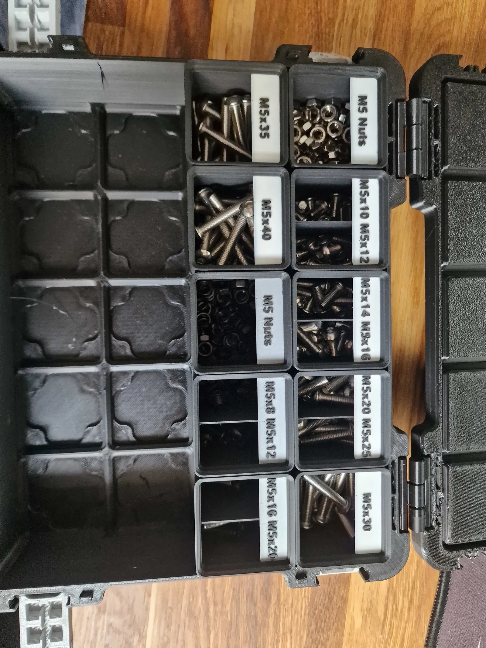 Các khay Gridfinity 1x1x6U này được thiết kế đặc biệt để đựng ốc M5, có nhãn dán sẵn. Mẫu này tối ưu vật liệu, không tích hợp nam châm. Anh em có thể tùy chỉnh màu chữ hoặc yêu cầu mẫu có nam châm nếu cần.