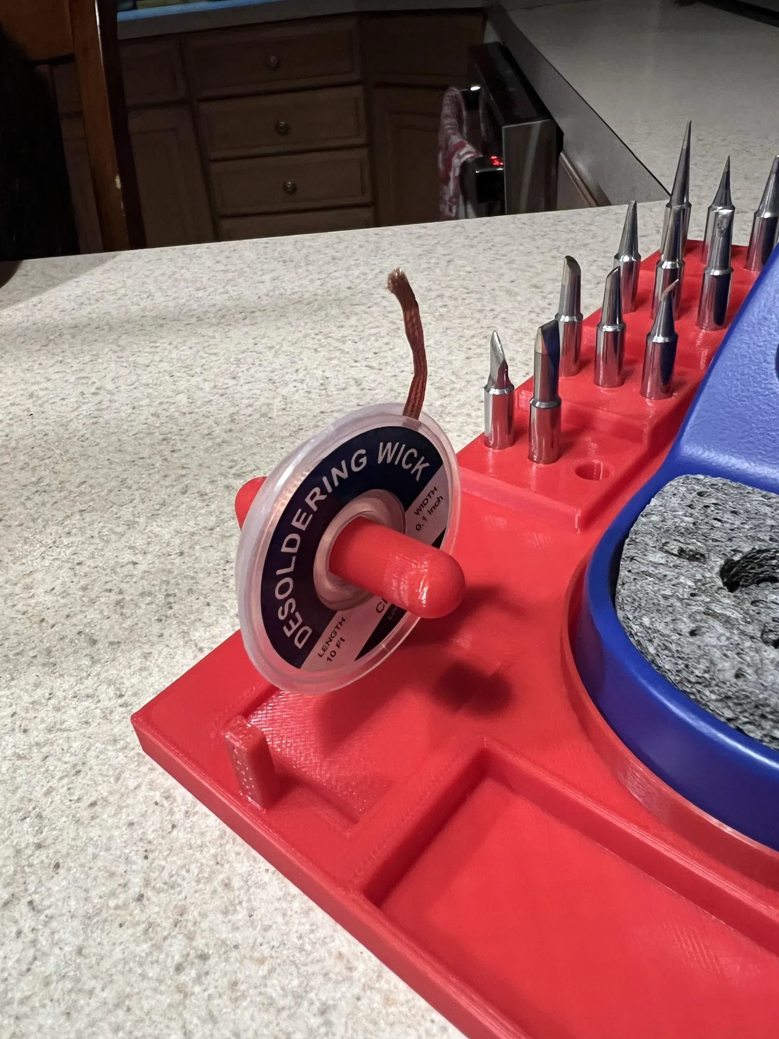 Có giá đỡ cuộn thiếc hàn với các lỗ với nhiều kích cỡ khác nhau để dẫn thiếc hàn có kích cỡ khác nhau.