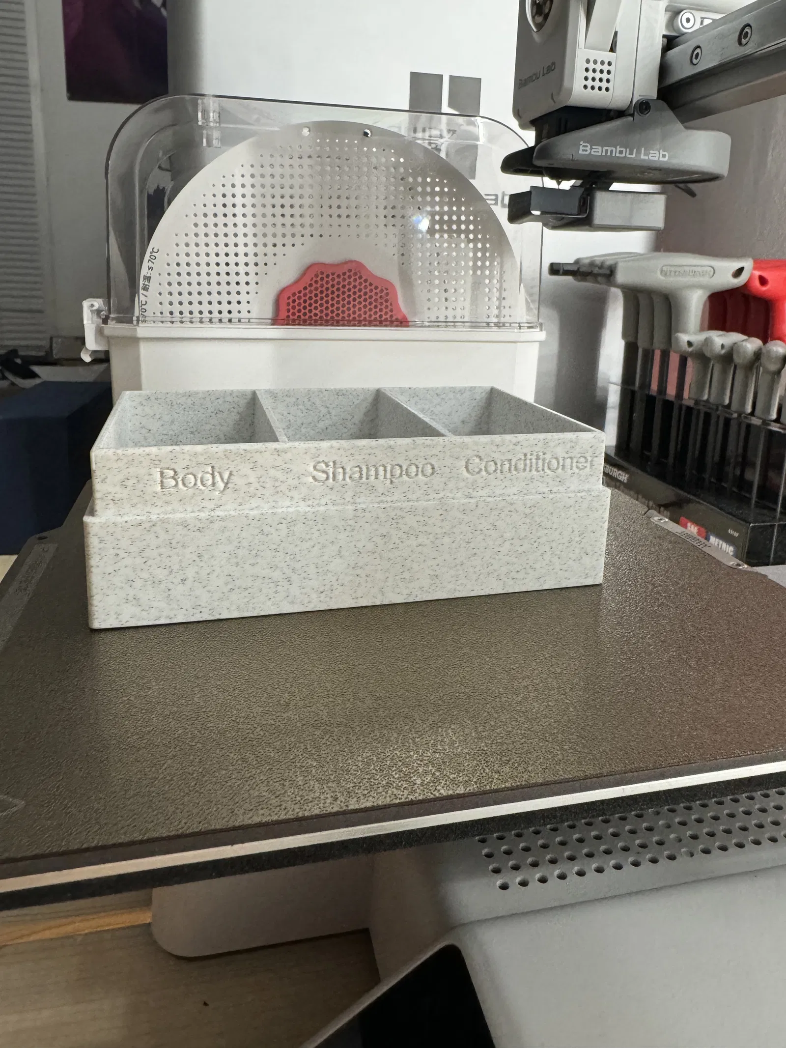 Hộp đựng xà bông đi du lịch 3 ngăn. Nắp hộp bấm vào giữ cho chắc, khỏi rớt trong túi. Có nhãn Body, Shampoo, Conditioner để dễ phân loại. Đáy hộp có gờ nổi để xà bông đỡ dính hơn.