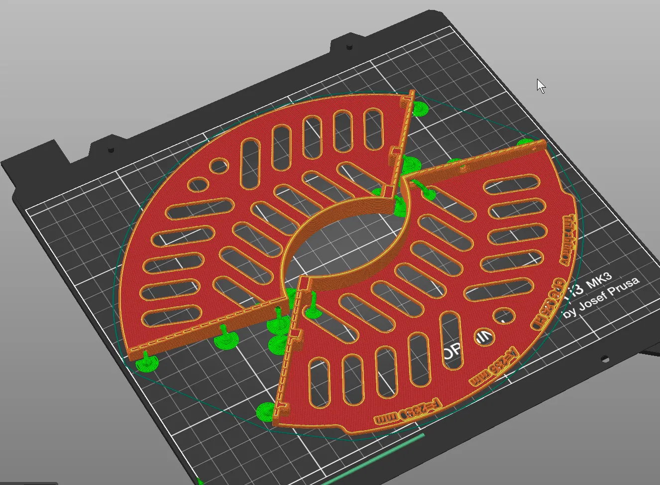 Có ba phần thiết kế để vừa với khay máy in Prusa MK3x. Tôi cũng đã thêm thiết kế một phần (đường kính 265 mm), nếu bạn có máy in lớn.
