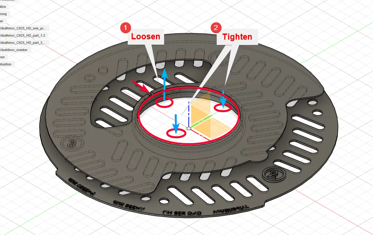 Tôi gọi vít dẫn động là quan trọng nhất - đó là vít đối diện với phần nhô ra nhỏ (và số). Có một rãnh nhỏ trên vòng trong, cho biết vít này là vít chính cho hướng hiệu chỉnh.