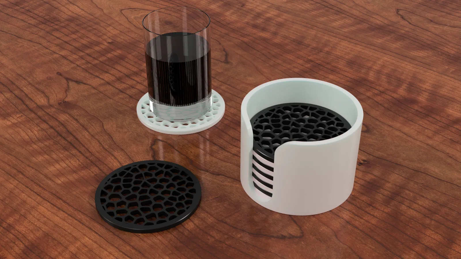 Bộ đế lót ly uống nước họa tiết Voronoi, có thể đựng đến 15 miếng. Kích thước miếng lót ly 99x5mm, đế 110x80mm. Khuyến khích in bằng PETG, không cần hỗ trợ. Có file Fusion 360 cho phép chỉnh sửa.