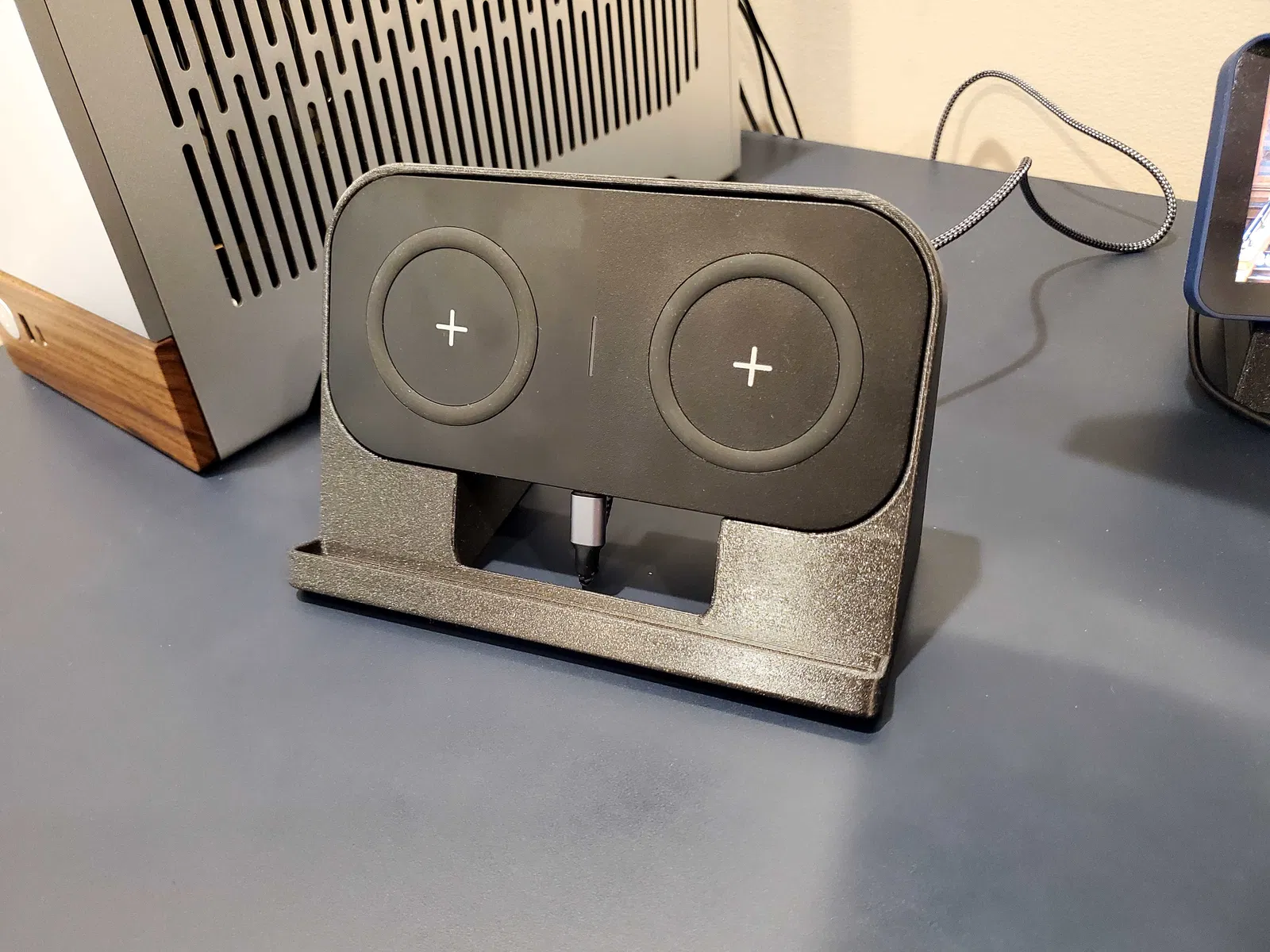 Giữ bộ sạc đôi Qi, có chỗ đựng dây cáp thừa; bộ sạc dễ dàng tháo ra để mang đi du lịch. Đế sạc này được thiết kế để sạc hai điện thoại cùng lúc, vừa vặn trên máy in Prusa Mini, với chỗ quấn dây cáp gọn gàng.