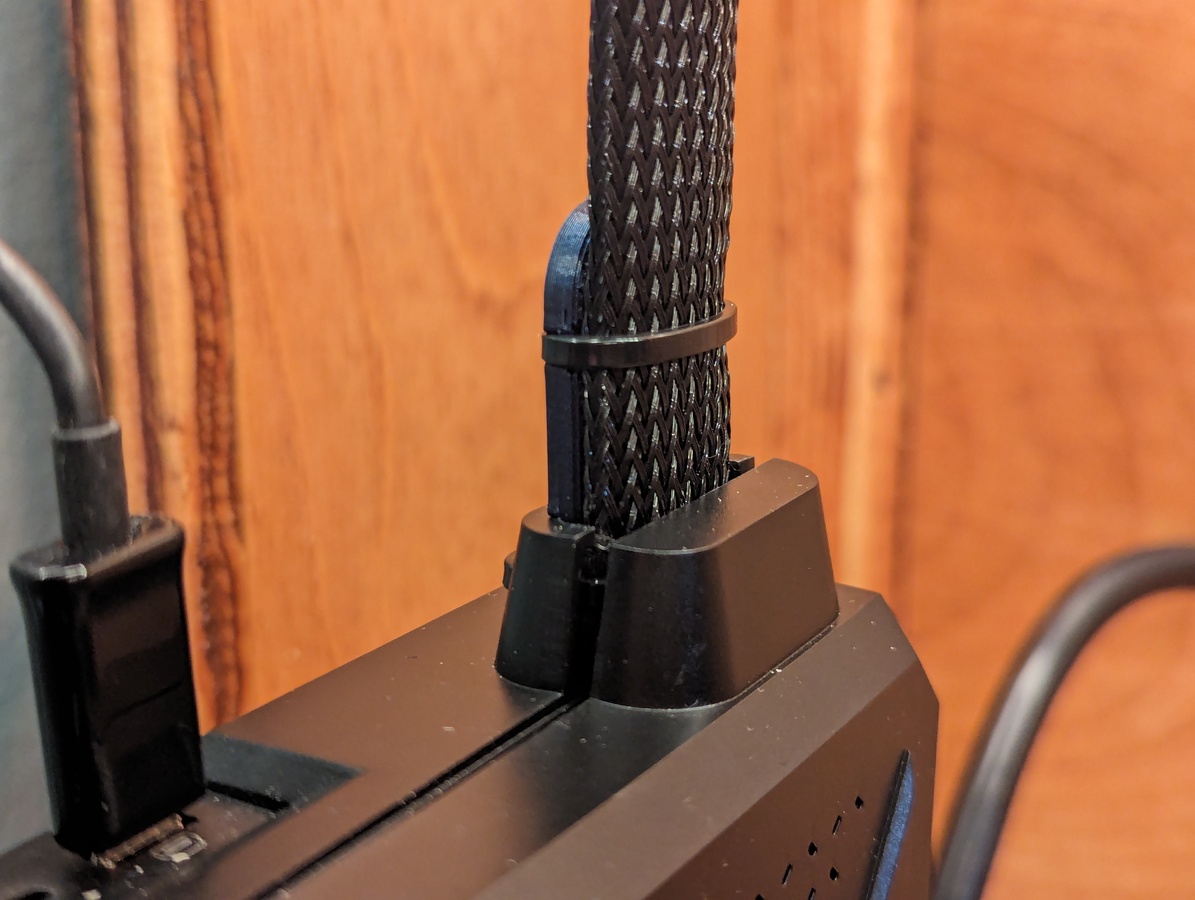 Gắn một dây rút thứ hai quanh bộ phận hỗ trợ và dây cáp máy đùn bằng cách sử dụng các khía trên cùng của bộ phận hỗ trợ. Cắt bỏ phần dây rút thừa. Hoàn thành!