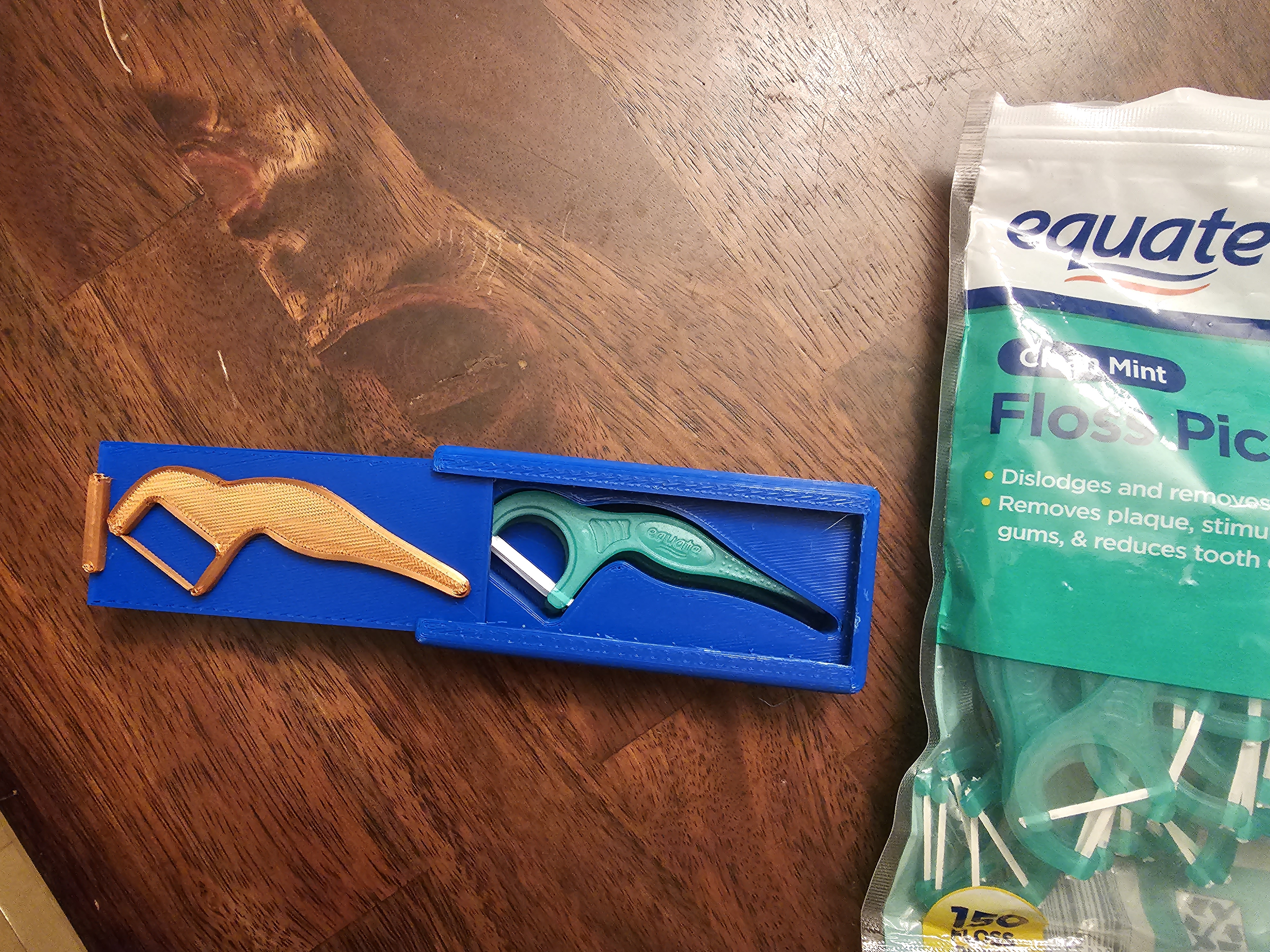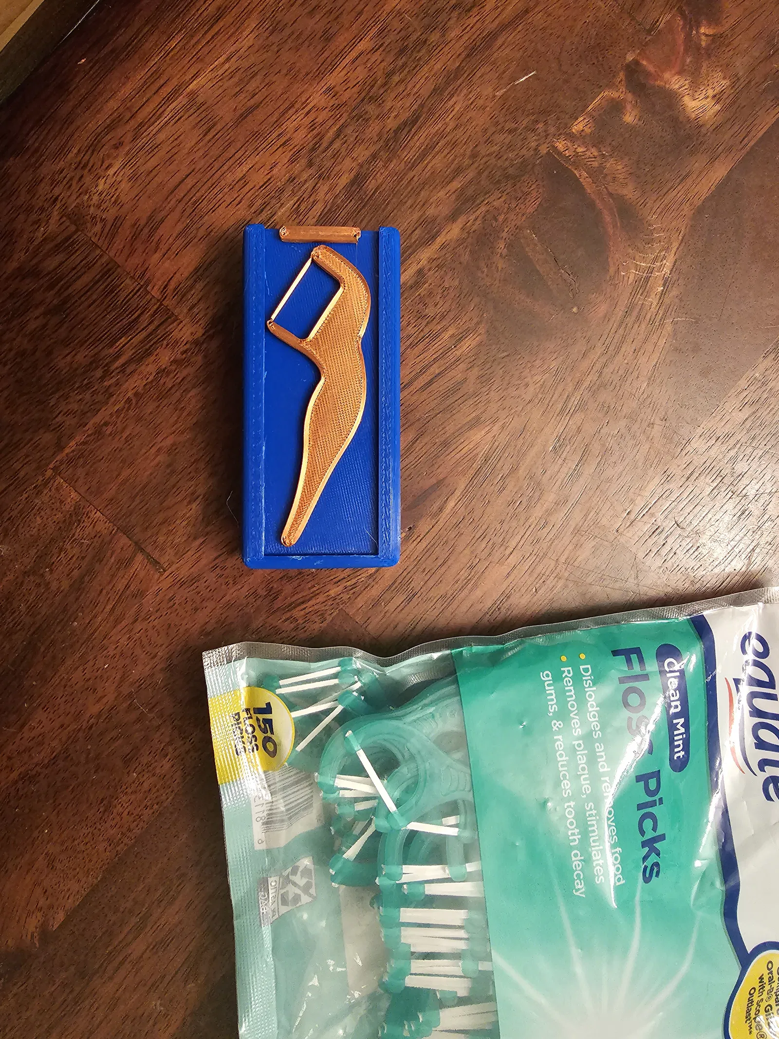 Giá đỡ tăm chỉ nha khoa. Tôi thiết kế cái này để đựng tăm chỉ hiệu Equate nhưng tôi cũng thử mấy hiệu khác và thấy cũng vừa luôn. Có thể thêm tùy chọn đổi màu để cây tăm chỉ có màu khác. Đựng được 6 cây nha.