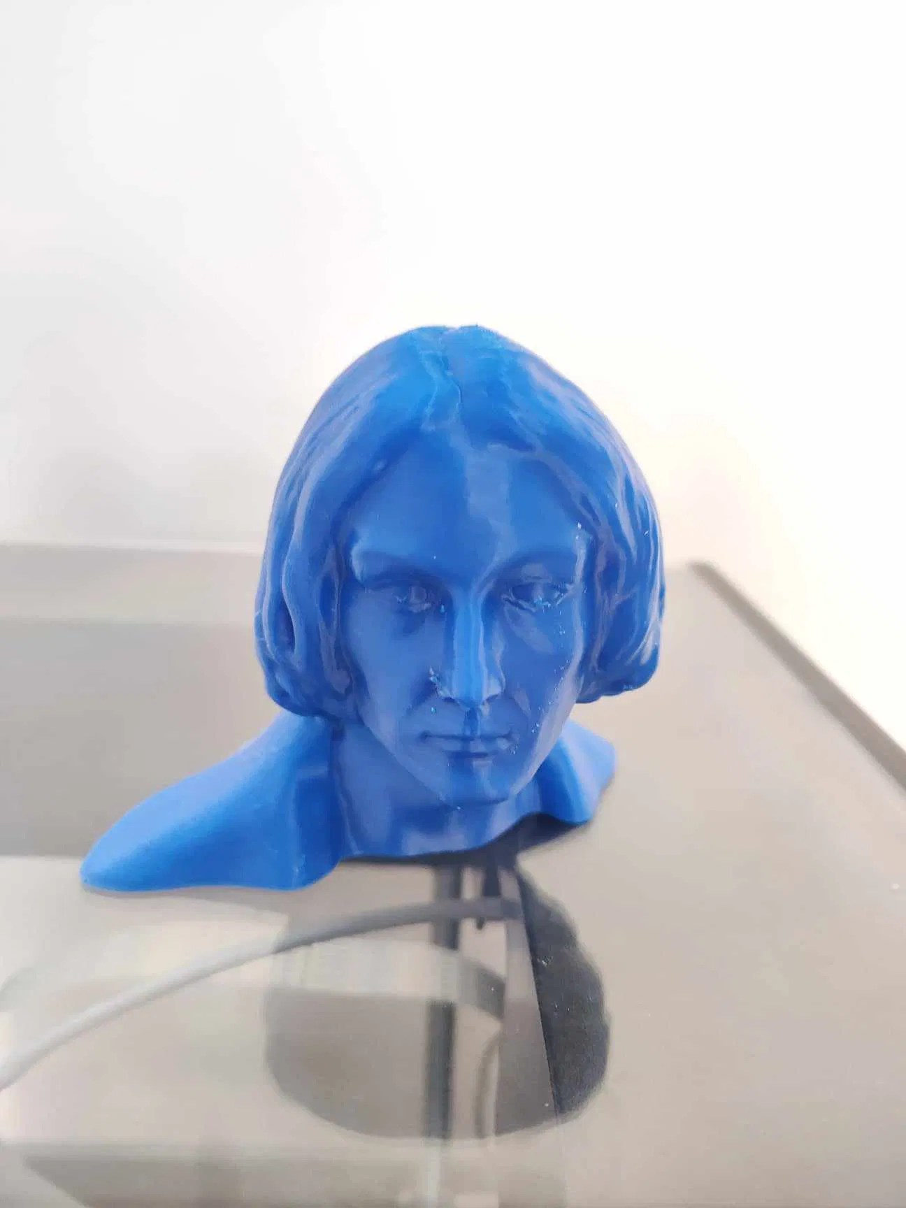 Mô hình STL đầu của Nicolaus Copernicus, được tạo ra và in cho Trường Kinh tế Kỹ thuật ở Kielce. Thông số in chi tiết cho vật liệu PLA Blue trên máy Makerbot Sketch, bao gồm chiều cao lớp 0.1mm, mật độ 55%, và nhiệt độ đầu in 215°C.
