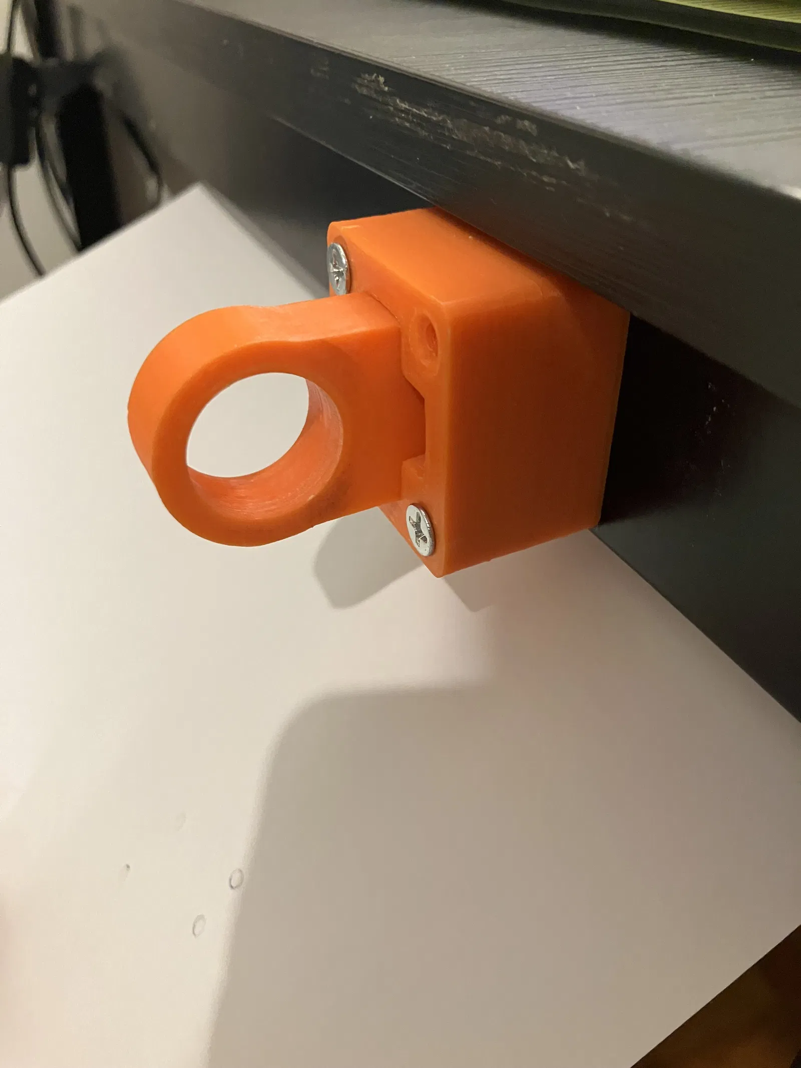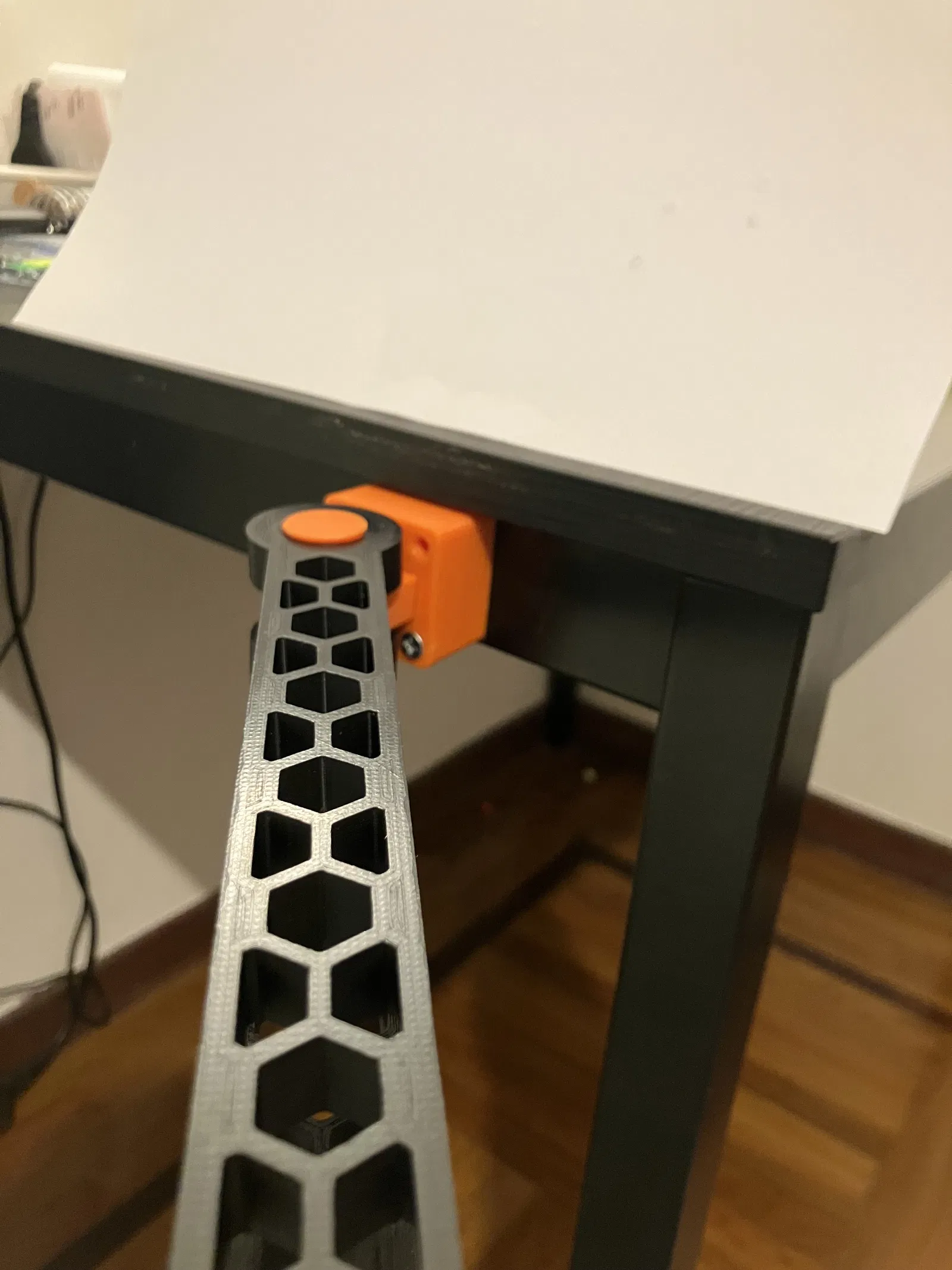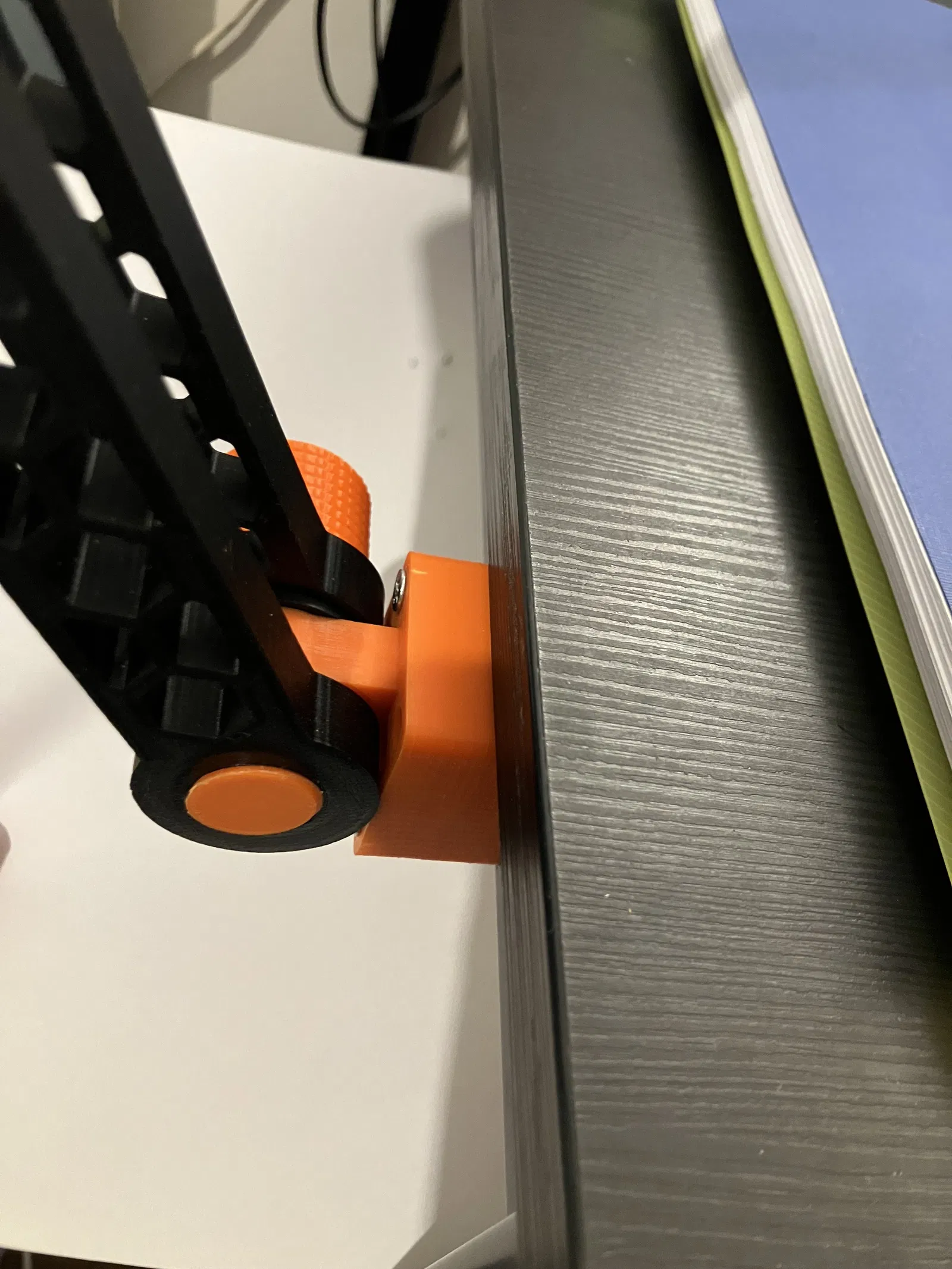 Đế bắt vít cho tay đỡ linh hoạt. Sản phẩm này được làm để định vị tay đỡ theo chiều dọc và ngang, có thể chịu tải trọng 2kg. Nên in với infill cao và có thể sử dụng gioăng cao su để tăng ma sát. Cần chà nhám nhẹ để khớp các bộ phận.