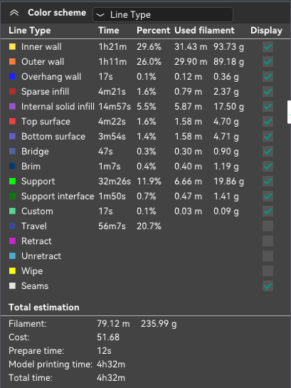 Cùng cài đặt với đầu phun 0.8mm @ lớp cao 0.48mm, 4 lớp tường, hỗ trợ dạng organic và 30% adaptive cubic infill chỉ tốn 4.5 tiếng.