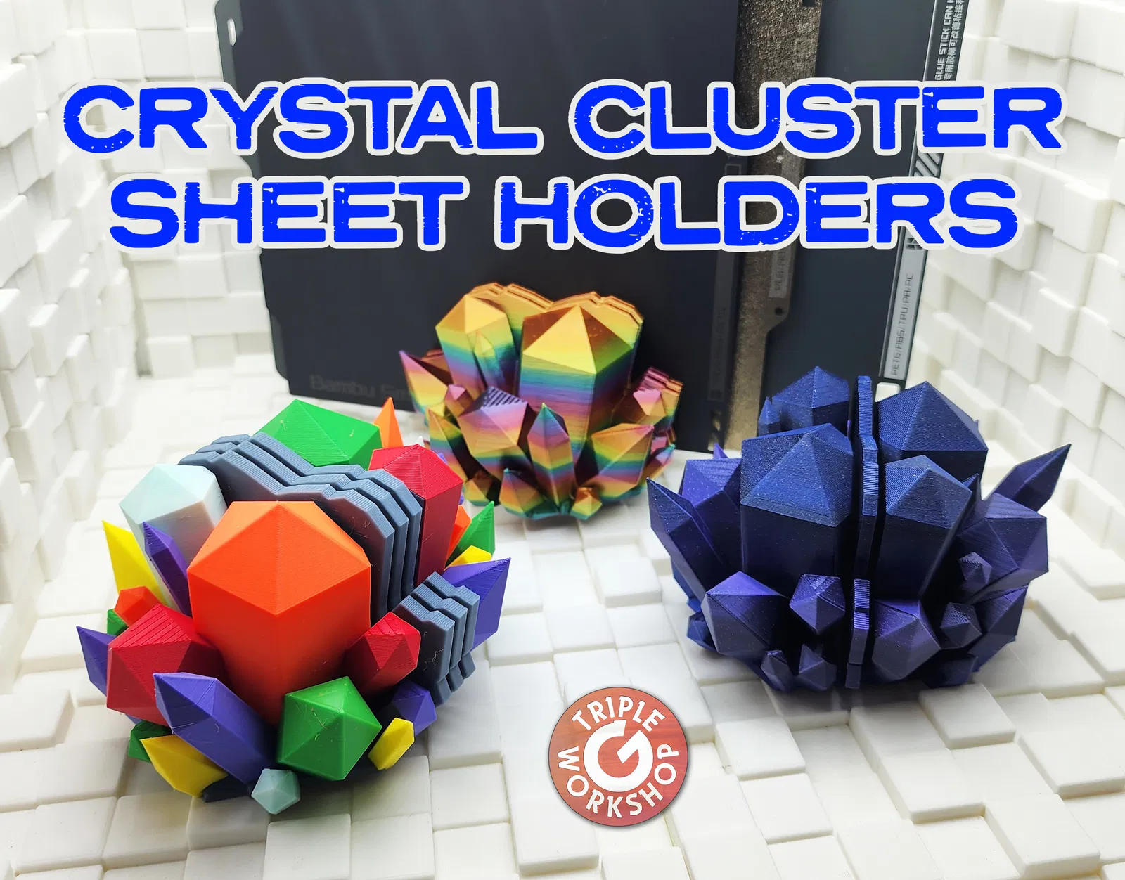 Giá đỡ khay in hình chùm pha lê độc đáo, cho phép bạn lưu trữ từ 1 đến 7 khay in. Thiết kế thông minh, in không cần support, vừa tiết kiệm vật liệu vừa mang tính thẩm mỹ cao. Lưu trữ khay in của bạn một cách gọn gàng và phong cách.