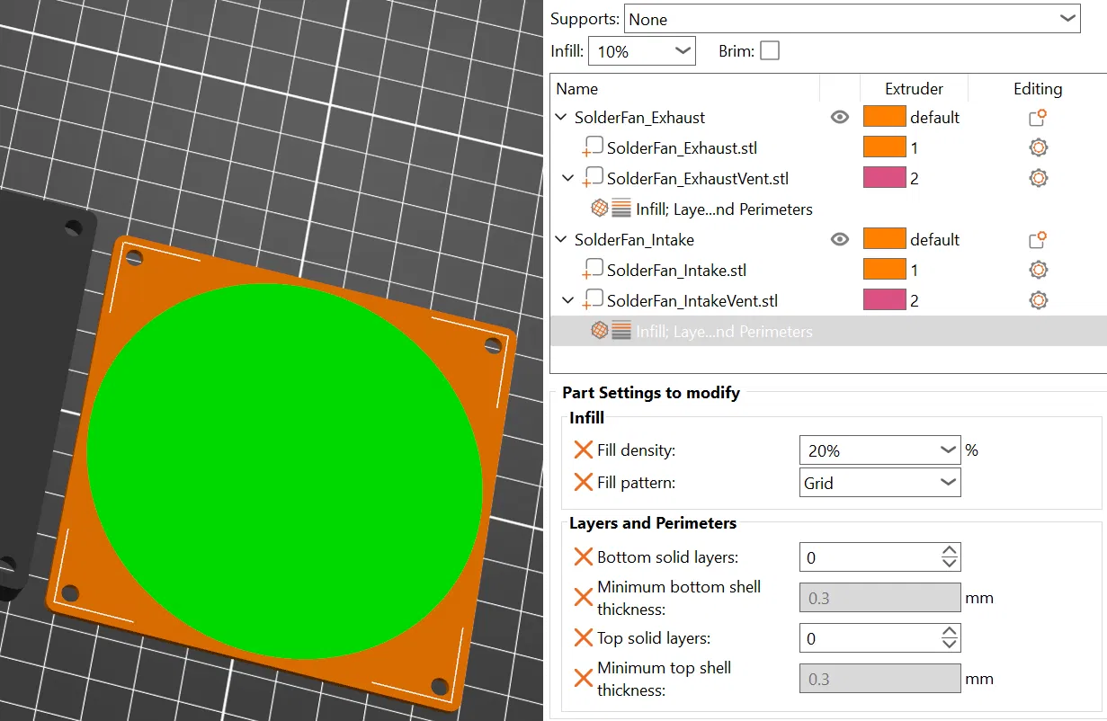 Sau đó chọn in cái body bình thường, còn cái Vent thì in không lớp trên dưới với infill khoảng 20% thôi (như hình nè).